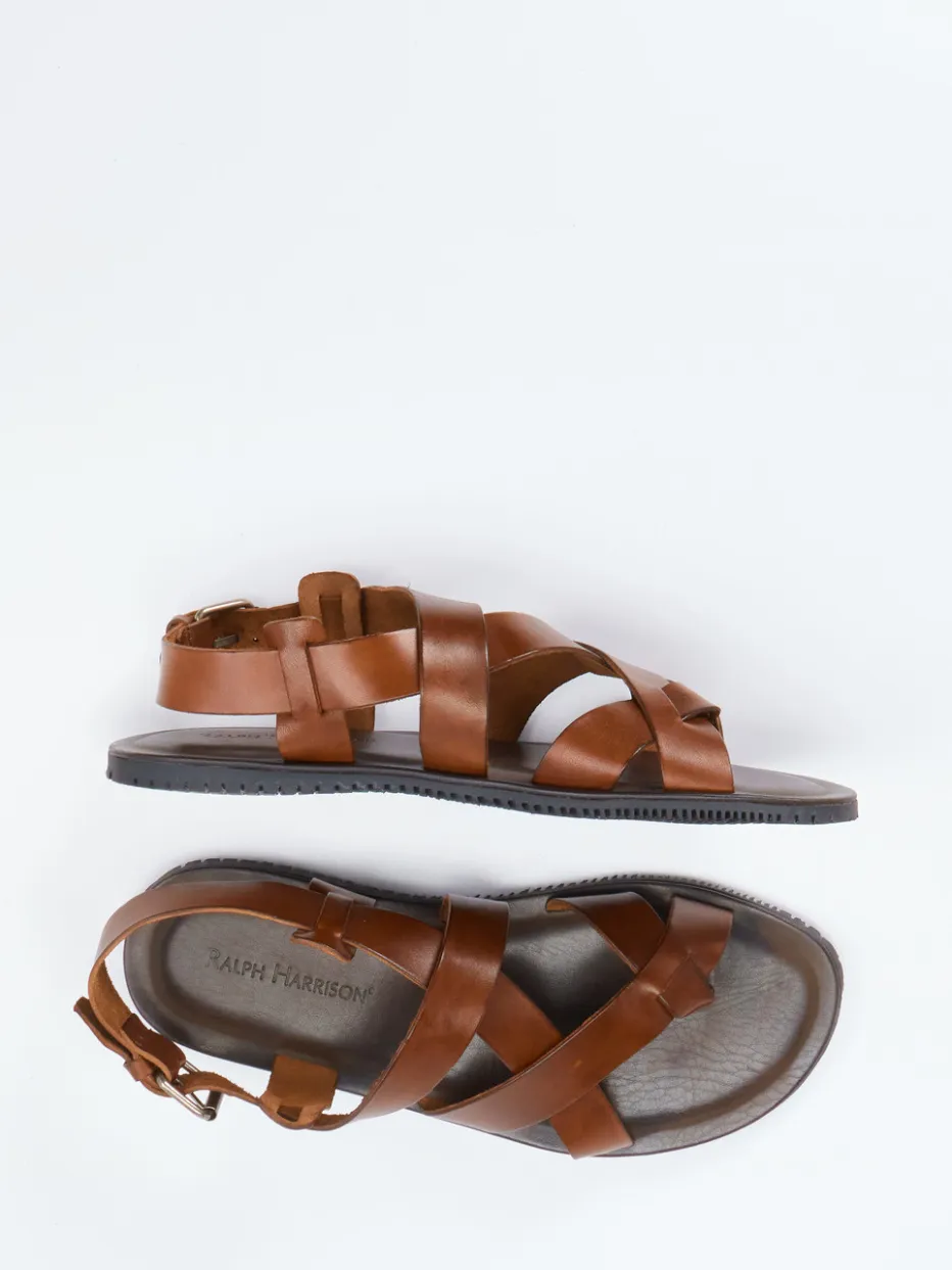 Schlichte Eleganz für warme Tage.Ralph Harrison interpretiert klassische Herren-Sandalen neu. Ideal für entspannte Sommertage und Reisen bietet dieses Modell mit überkreuzten Riemen, Zehensteg und verstellbarer Fersenschnalle sicheren Halt und bleibenden Stil. Das matt strukturierte Kalbleder in Mittelbraun wirkt dezent und hochwertig zugleich. Innen überzeugt das vollständig gepolsterte Lederfußbett, während die schwarze, fein profilierte Gummisohle für Rutschfestigkeit sorgt. Dezent erinnert die Formensprache an antike Archetypen, modern umgesetzt für die „Quiet Luxury“-Strömung. Kombiniert mit Leinenhose und Kurzarmhemd entsteht ein gepflegter Freizeitlook. Markentypische Verarbeitung trifft auf langlebigen Tragekomfort.