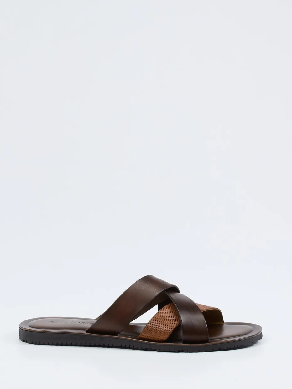 Stilsicher durch den Sommer.Ralph Harrison präsentiert mit dieser Pantolette ein Herrenmodell, das Funktionalität und Understatement vereint. Ideal für Freizeit und Urlaub, bietet das Modell mit seinen gekreuzten, teils perforierten Riemen aus samtig-mattem Kalbleder in Dunkelbraun und Cognac einen dezenten Look ganz im Zeichen des Quiet Luxury. Die flache Silhouette mit profilierter Gummisohle sorgt für Halt und Tragekomfort – auch bei längeren Wegen. Optisch ist die Pantolette reduziert und dennoch markant, unterstützt durch Ton-in-Ton-Optik und klare Linienführung. Perfekt zu Leinenhose und Kurzarmhemd kombinierbar. Bequemer Stil auf hohem Niveau – designed für entspannte Sommertage.