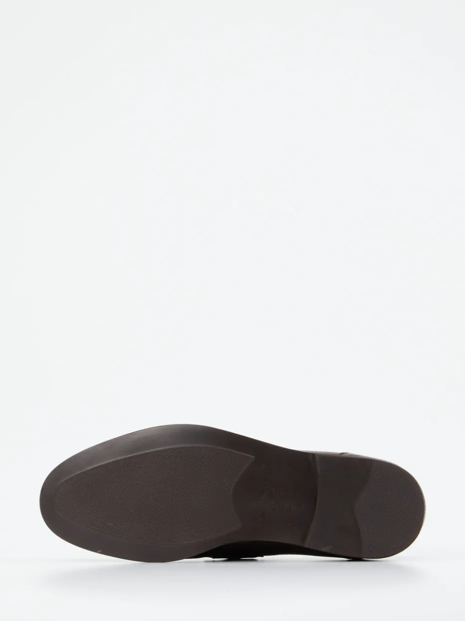 Schlichte Klasse im Detail.Ralph Harrison präsentiert einen Herren-Loafer der Kategorie Penny Loafer. Ob im Büroalltag oder zu gehobenen Casual-Looks – dieser Schuh erfüllt den Anspruch an stilistische Zurückhaltung mit Qualitätsversprechen. Gefertigt aus dunkelbraunem Kalbleder mit strukturierter Narbung und mattem Finish, überzeugt das Modell durch klassische, schmal gehaltene Linienführung und eine Zunge mit angedeutetem Penny-Slot. Der flache Blockabsatz und die flexible Gummisohle unterstreichen den Komfortanspruch, unterstützt vom ledergefütterten Innenraum. Die reduzierte Ästhetik spricht Liebhaber von „Quiet Luxury“ und Heritage-Stil an. Ein puristisches Stilstatement mit zeitloser Relevanz.