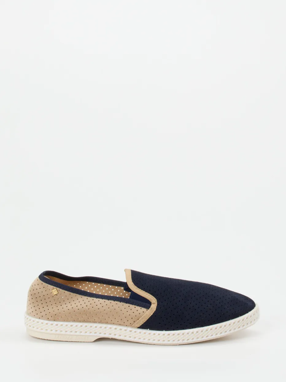 Sommerkomfort mit mediterranem Flair.Rivieras präsentiert diesen bequemen Slipper für Herren aus der Kategorie Slip-On Espadrilles. Ideal für Urlaubstage oder entspannte Stadtausflüge kombiniert der Slipper dunkelblaues und beigefarbenes Veloursleder in perforierter Ausführung mit einem lederbezogenen Fußbett und flexibler Gummisohle. Durch elastische Einsätze gelingt der Einstieg mühelos; ein Ton-in-Ton Einfassband und eine goldfarbene Logo-Applikation ergänzen das minimalistische Design. Die klassische flache Form spiegelt dezenten mediterranen Stil wider, angelehnt an den aktuellen Soft-Neutrals-Trend. Harmoniert perfekt mit Leinenhose oder heller Chino. Markentypisch vereint dieser Slipper Komfort, maritimes Understatement und unaufdringliche Raffinesse.