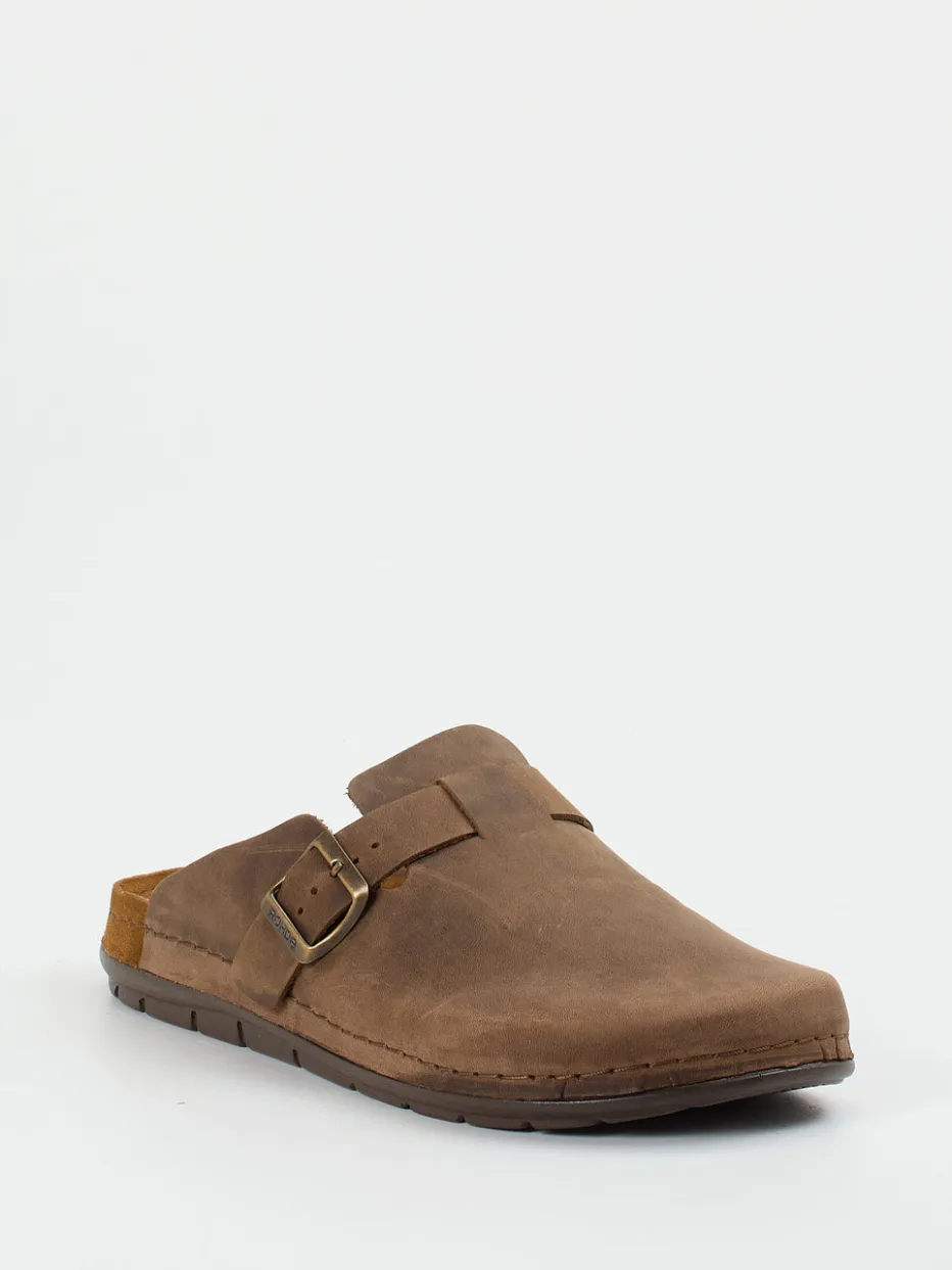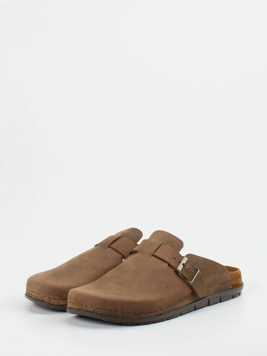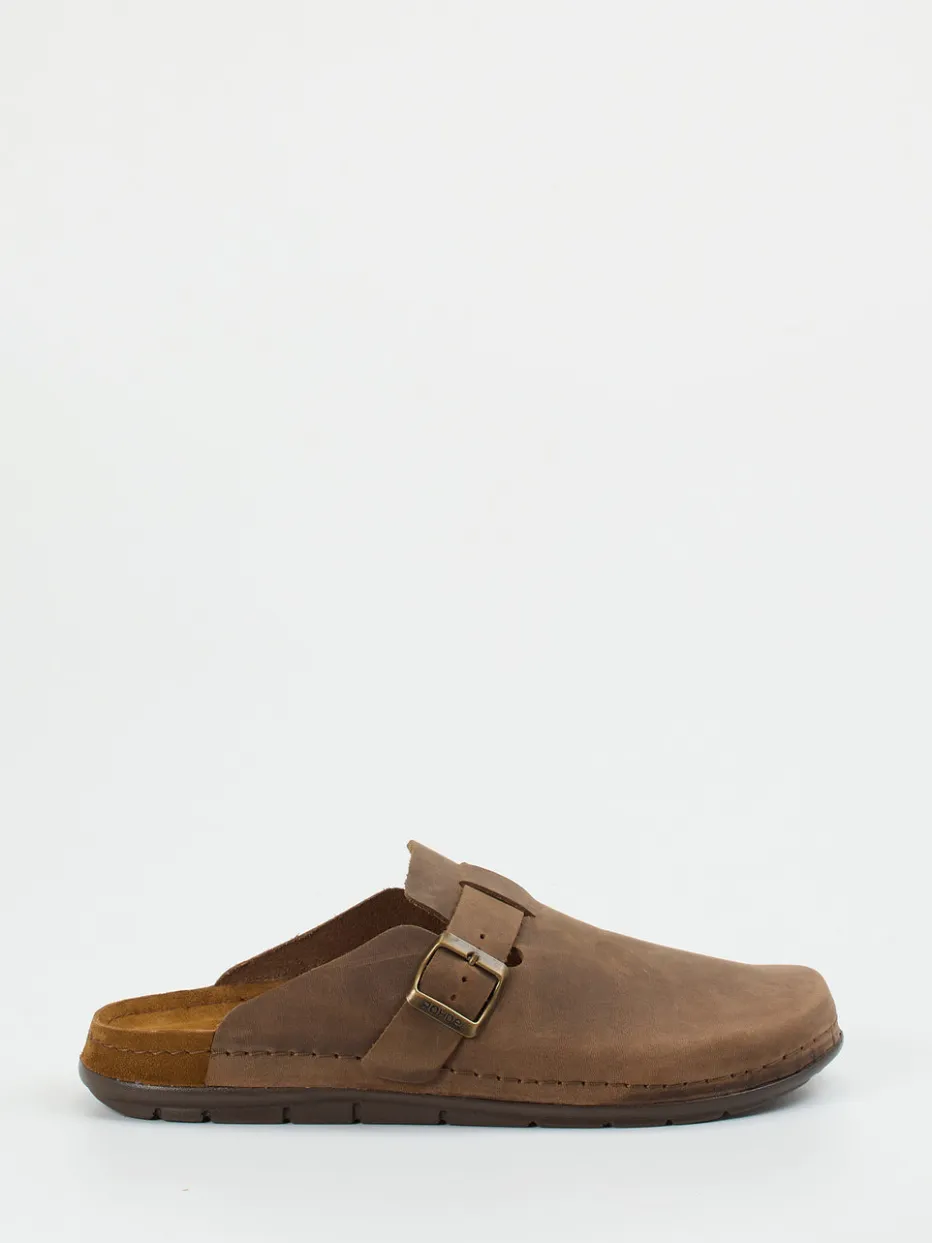 Rustikale Eleganz trifft auf Komfort.Rohde präsentiert mit dieser Unisex-Pantolette einen klassisch inspirierten Clog mit dezenter Modernität. Für gemütliche Stunden zu Hause oder legere Freizeitmomente bietet dieses Modell aus robustem Kalbleder mit samtig-matter Nubukstruktur optimale Voraussetzungen. Die warme Mittelbraun-Nuance, die geschlossene Zehenpartie und das cleane, offene Fersendesign unterstreichen den naturverbundenen Look. Eine antik anmutende, verstellbare Metallschnalle mit dezentem Logo ergänzt das minimalistische Gesamtbild. Innen sorgt ein weich gepolstertes, lederbezogenes Fußbett für bequemen Halt, während die profilierte Gummisohle mit Shock-Absorber jeden Schritt abfedert. Trendgerecht in der „Quiet Luxury“-Ästhetik passt dieser Clog ideal zu Leinenhosen oder Strick. Geradliniger Komfort mit dezenter Markenqualität von Rohde.