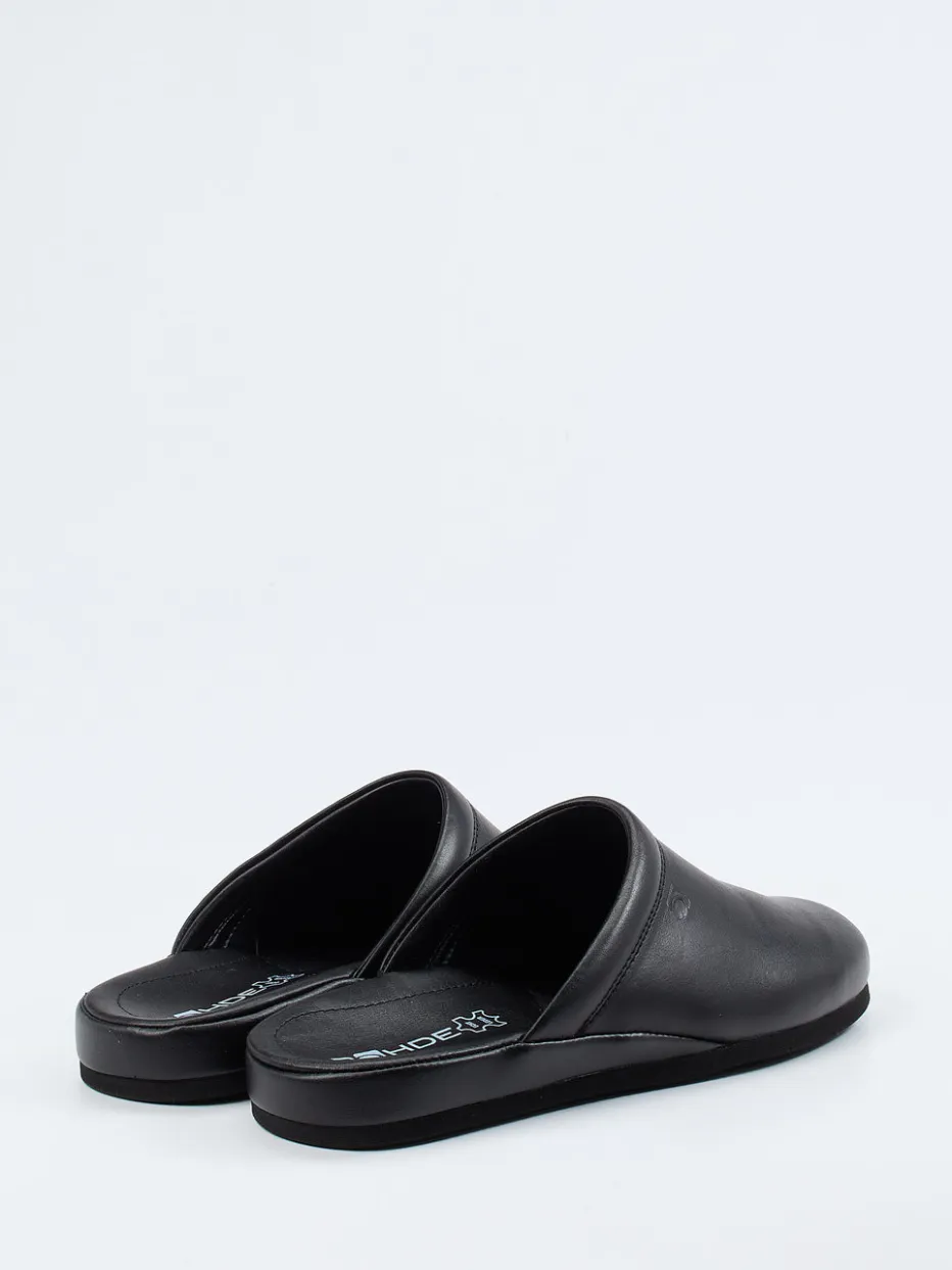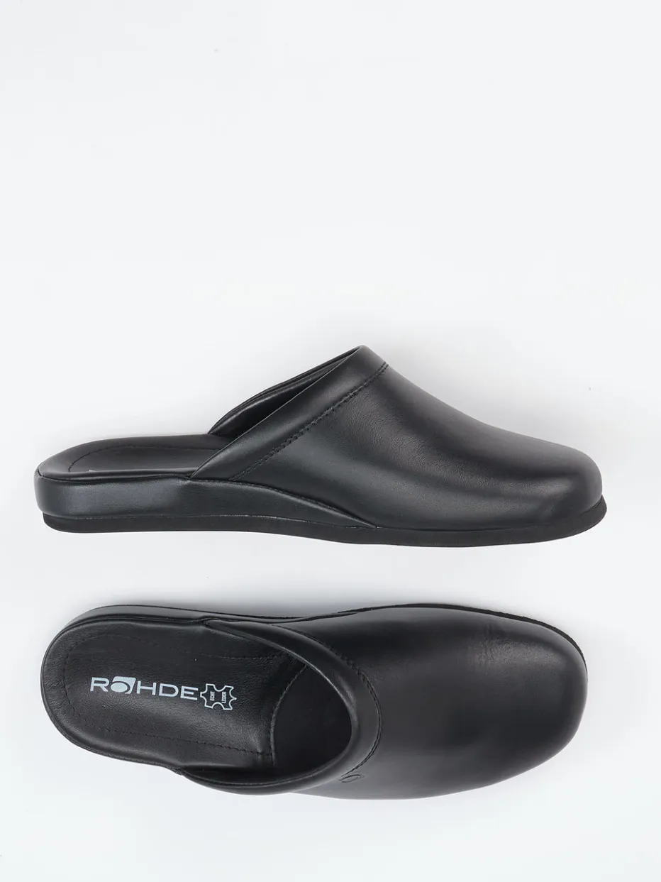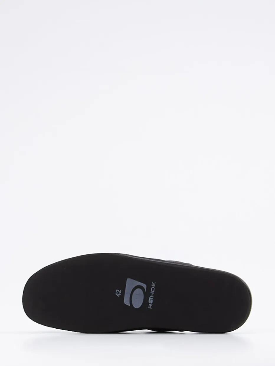 Minimalismus trifft Komfort.Rohde interpretiert den klassischen Herrenhausschuh als moderne Pantoffel mit reduziertem Designanspruch. Ob morgens beim ersten Kaffee oder abends nach einem langen Tag – diese Pantolette unterstützt entspannte Momente in stilvollem Rahmen. Gefertigt aus schwarzem Kalbleder mit matter Oberfläche und einem weichen Textilfutter bietet sie ein angenehmes Tragegefühl. Die ergonomische Innensohle und die rutschhemmende Gummisohle sorgen für sicheren Halt und hohen Komfort. Die offene Ferse erleichtert das Hineinschlüpfen, während dezente Ton-in-Ton-Nähte und ein seitliches Präge-Logo das minimalistische Erscheinungsbild abrunden. Perfekt kombinierbar mit einem Hausanzug oder Morgenmantel. Zeitlose Qualität für komfortbewusste Ästheten.