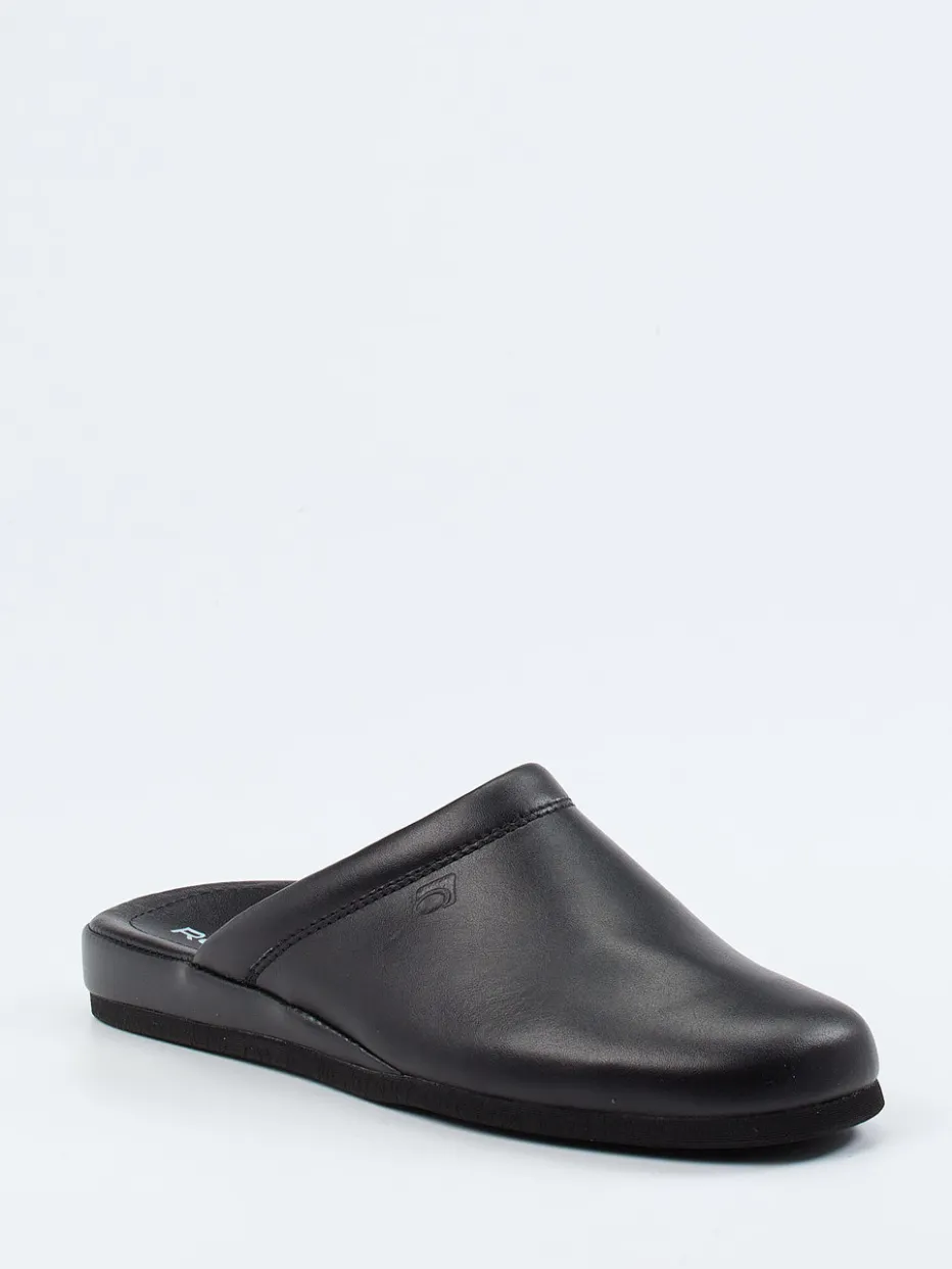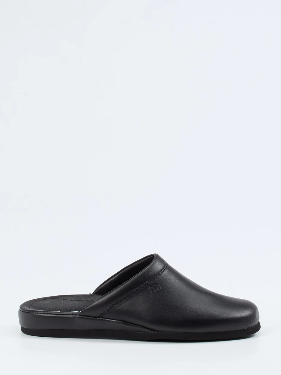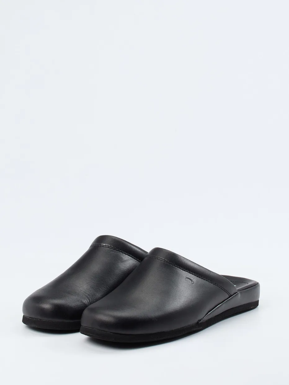 Minimalismus trifft Komfort.Rohde interpretiert den klassischen Herrenhausschuh als moderne Pantoffel mit reduziertem Designanspruch. Ob morgens beim ersten Kaffee oder abends nach einem langen Tag – diese Pantolette unterstützt entspannte Momente in stilvollem Rahmen. Gefertigt aus schwarzem Kalbleder mit matter Oberfläche und einem weichen Textilfutter bietet sie ein angenehmes Tragegefühl. Die ergonomische Innensohle und die rutschhemmende Gummisohle sorgen für sicheren Halt und hohen Komfort. Die offene Ferse erleichtert das Hineinschlüpfen, während dezente Ton-in-Ton-Nähte und ein seitliches Präge-Logo das minimalistische Erscheinungsbild abrunden. Perfekt kombinierbar mit einem Hausanzug oder Morgenmantel. Zeitlose Qualität für komfortbewusste Ästheten.