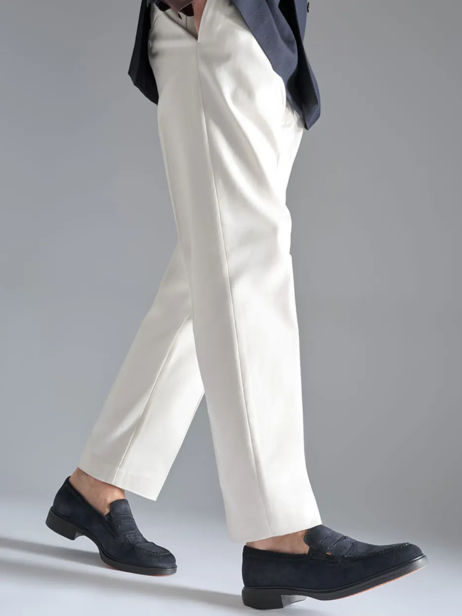 Italienischer Minimalismus im Alltag.Santoni interpretiert mit diesem Herren-Loafer klassische Eleganz neu. Ideal für den Büroalltag oder gehobene Freizeitlooks bietet das Modell dank elastischem Einstieg und flexibler Gummisohle besonderen Tragekomfort. Das dunkelblaue Veloursleder mit samtiger Oberfläche betont die klar konturierte Silhouette, während das orangefarbene, gepolsterte Innenfutter für einen markentypischen Akzent sorgt. Feine Ziernähte unterstreichen den minimalistischen Stil – perfekt für Liebhaber des „Quiet Luxury“. Kombiniert mit heller Chino gelingt ein smartes Outfit mit modischer Raffinesse. Sensibel gestaltet in Material, Form und Finish – kompromisslos im Anspruch von Santoni.