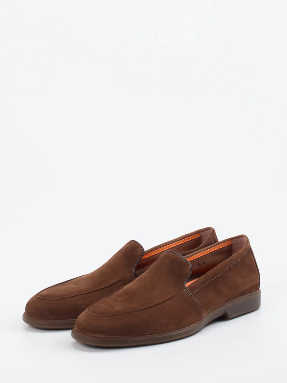 Eleganz trifft Alltagskomfort.Als Teil der Herrenschuh-Kollektion besticht dieser Loafer von Santoni durch seine edle Verarbeitung und dezente Farbgebung. Für den gehobenen Alltag oder den smarten Business-Look: Der Loafer aus hochwertigem Veloursleder zeigt sich in warmem Mittelbraun mit samtiger Oberfläche und wird durch orangefarbenes Innenfutter stilvoll akzentuiert. Die schlanke, flache Silhouette kommt dank seiner Schlupfform ohne Verschluss aus. Ton-in-Ton-Nähte und eine rutschhemmende Gummisohle unterstreichen das minimalistische Design, während italienische Färbetechnik dem Leder Tiefe verleiht. Der Look passt zu Chino, Anzug oder Denim. Handgefertigte Qualität mit eleganter Lässigkeit – typisch Santoni.