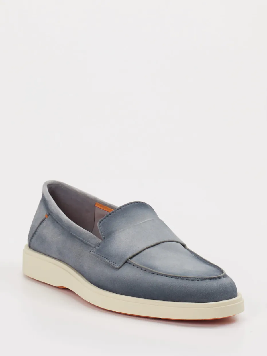 Komfort trifft unaufgeregten Stil. Santoni präsentiert mit diesem Herren-Slipper einen klassischen Penny Loafer für stilbewusste Alltags- und Business-Looks. Ideal für urbane Alltagsszenarien bietet das Modell hochwertiges Veloursleder mit matter Oberfläche und eine rutschfeste Gummisohle. Der taubenblaue Farbton trifft auf präzise Ton-in-Ton-Nähte und ein Kontrastfutter in leuchtendem Orange. Typische Details wie der Penny-Riegel und eine minimalistische Form prägen die klare Designsprache. Der Schuh betont ein leises Luxusverständnis im Sinne moderner Soft-Tones-Ästhetik. Ein stilvoller Allrounder mit italienischem Understatement und funktionalem Tragekomfort.