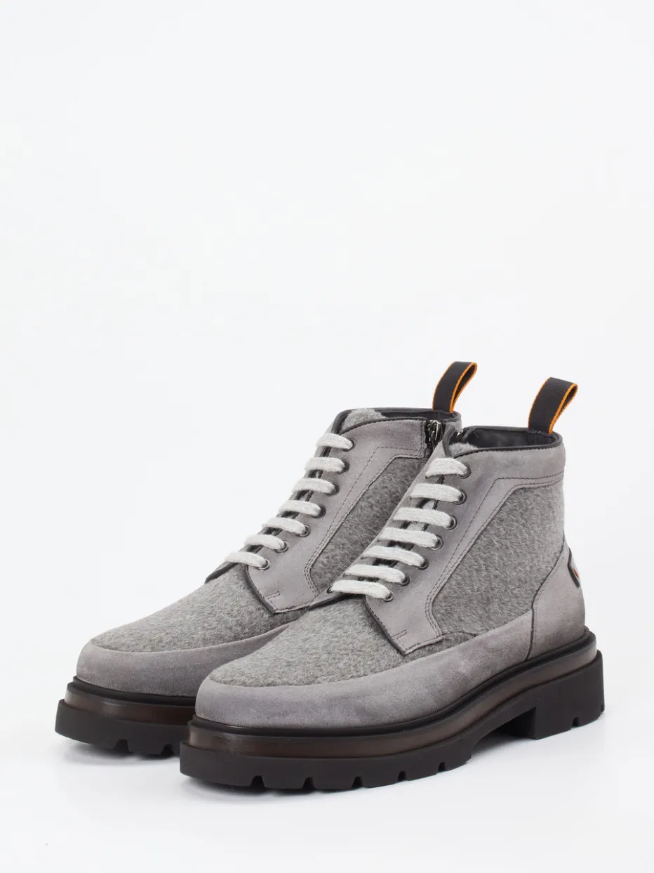 Stilvoller Begleiter mit urbanem Charakter.Santoni präsentiert diese luxuriösen Herren-Schnürboots aus feinem Veloursleder. Für kalte Tage in der Stadt oder längere Outdoor-Spaziergänge bieten diese knöchelhohen Boots mit Lammfellfutter angenehme Wärme und Tragekomfort. Das samtig genarbte, hellgraue Leder präsentiert sich im ausgewogenen Materialmix mit optisch markantem Filztextil. Der seitliche Reißverschluss ergänzt die Schnürung funktional und erleichtert den Einstieg. Die schwarze Gummisohle mit Profil sowie umlaufendem Rahmen in Holzoptik sorgt für sicheren Grip und Designtiefgang mit Utility-Charakter. Perfekt zu Wollmütze und Parka in gedeckten Tönen kombinierbar. Handwerkskunst von Santoni mit alltagstauglichem Komfort und progressivem Winterstyle.