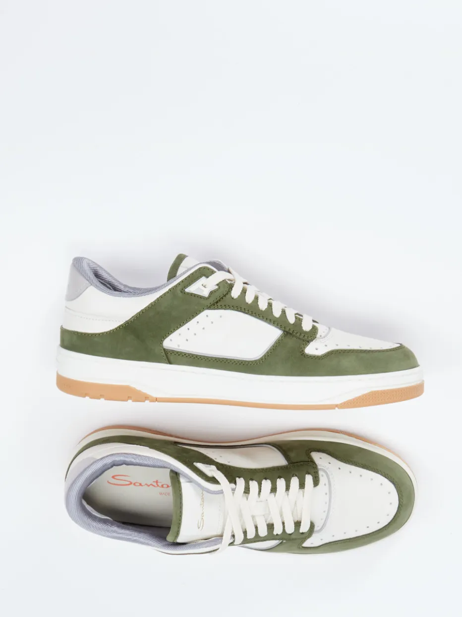 Dieser Santoni-Sneaker verbindet samtig angeschliffenes Nubukleder in Oliv mit edlem Kalbleder in Cremeweiß – ein stilvoller Materialmix mit Retro-Flair.