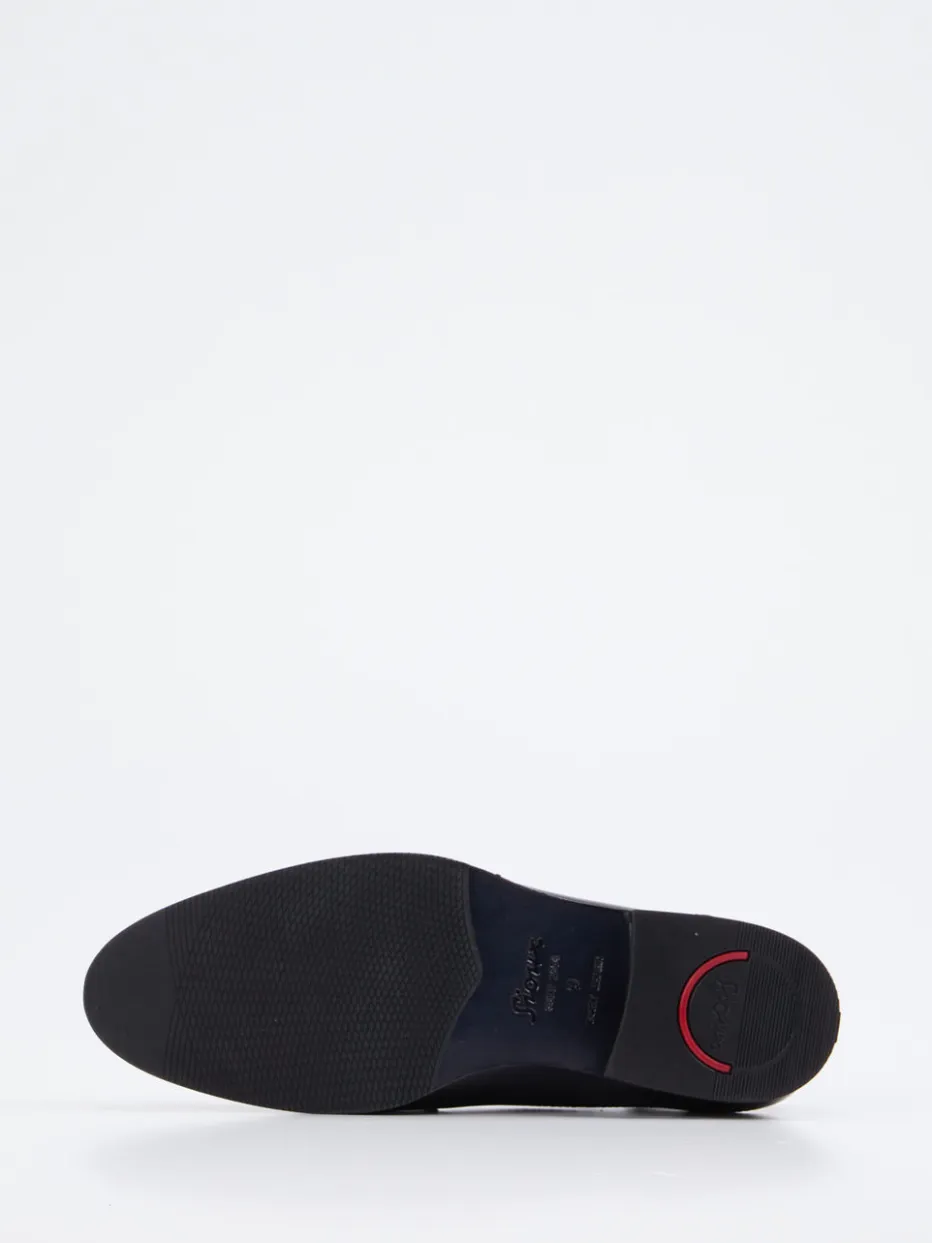 Eleganz in jeder Situation.Der Herrenschnürschuh von Sioux überzeugt als klassischer Derby mit edler Ausstrahlung und funktionalem Design. Perfekt für den Büroalltag oder festliche Anlässe – das glänzend verarbeitete Kalbleder in tiefem Schwarz sorgt für eine stilvolle Präsenz. Die schlanke Silhouette wird durch eine dezente 5-Loch-Schnürung und tonige Steppnähte ergänzt. Das geprägte Seitenlogo und der rote Akzent in der profilierten Gummisohle setzen subtile Akzente. Innenkomfort bietet ein weiches Wechselfußbett, auch für Einlagen geeignet. Stilistisch bewegt sich das Modell zwischen klassischem Minimalismus und modernem Formal-Trend. Ein stilvolles Statement mit langlebiger Wertigkeit und markentypischem Tragekomfort.