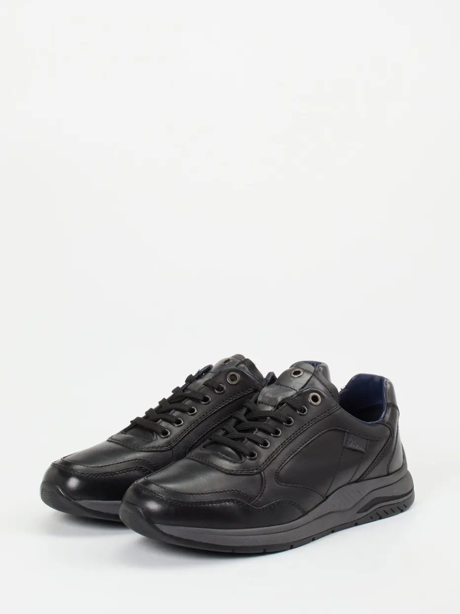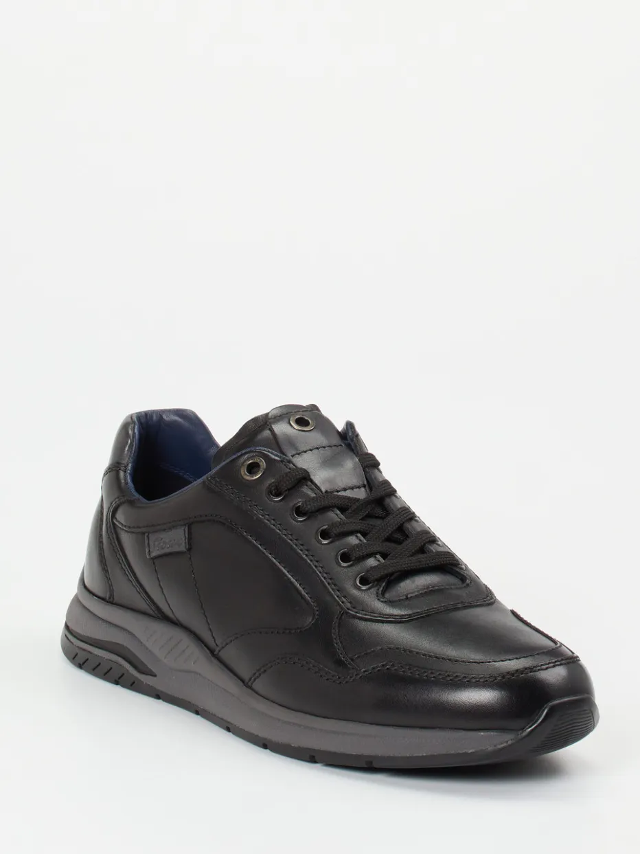Gefertigt aus weichem, mattem Kalbleder in tiefem Schwarz, ergänzt durch dezente Ton-in-Ton-Nähte und eine feine Markenprägung an der Seite. Die sportlich-klassische Silhouette wird durch einen gepolsterten Schaftrand und die dämpfende Leichtgummisohle funktional unterstützt. Dezente Streetwear-Akzente treffen auf ruhige Eleganz.