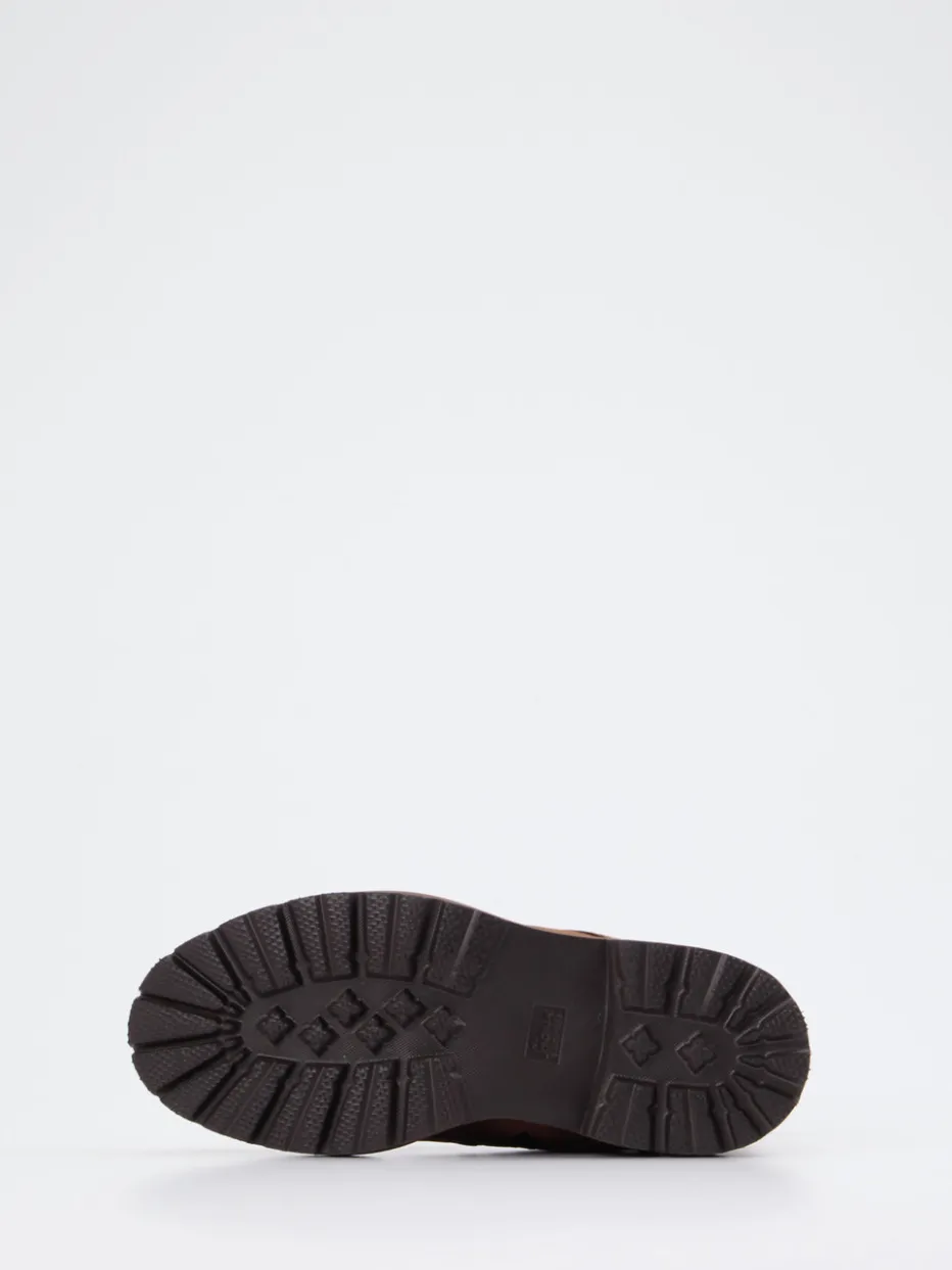 Ob beim Spaziergang im Wald oder im urbanen Alltag – das braune Nubukleder mit matter Oberfläche verbindet Langlebigkeit mit einem gepflegten Erscheinungsbild. Warmes Lammfellfutter sorgt für Komfort auch an frostigen Tagen, unterstützt durch eine rutschfeste Gummisohle mit markantem Profil. Optische Akzente setzen Metallösen, Kontrastnähte und ein textil gepolsterter Schaft. Schnürung und seitlicher Reißverschluss erleichtern das Anziehen. Im Utility-Stil gehalten, passt der Look ideal zu Outdoorjacke und Leggings.
