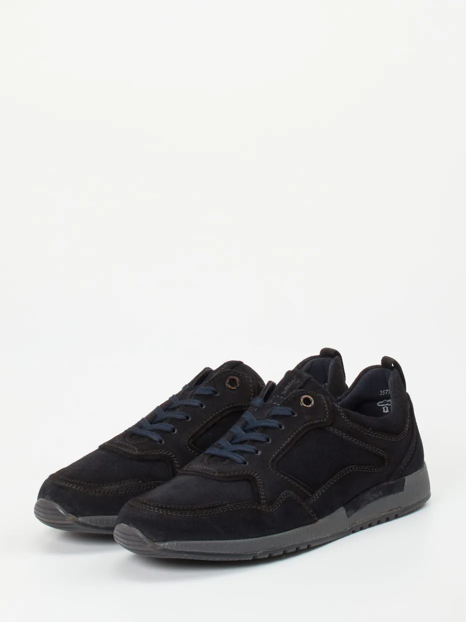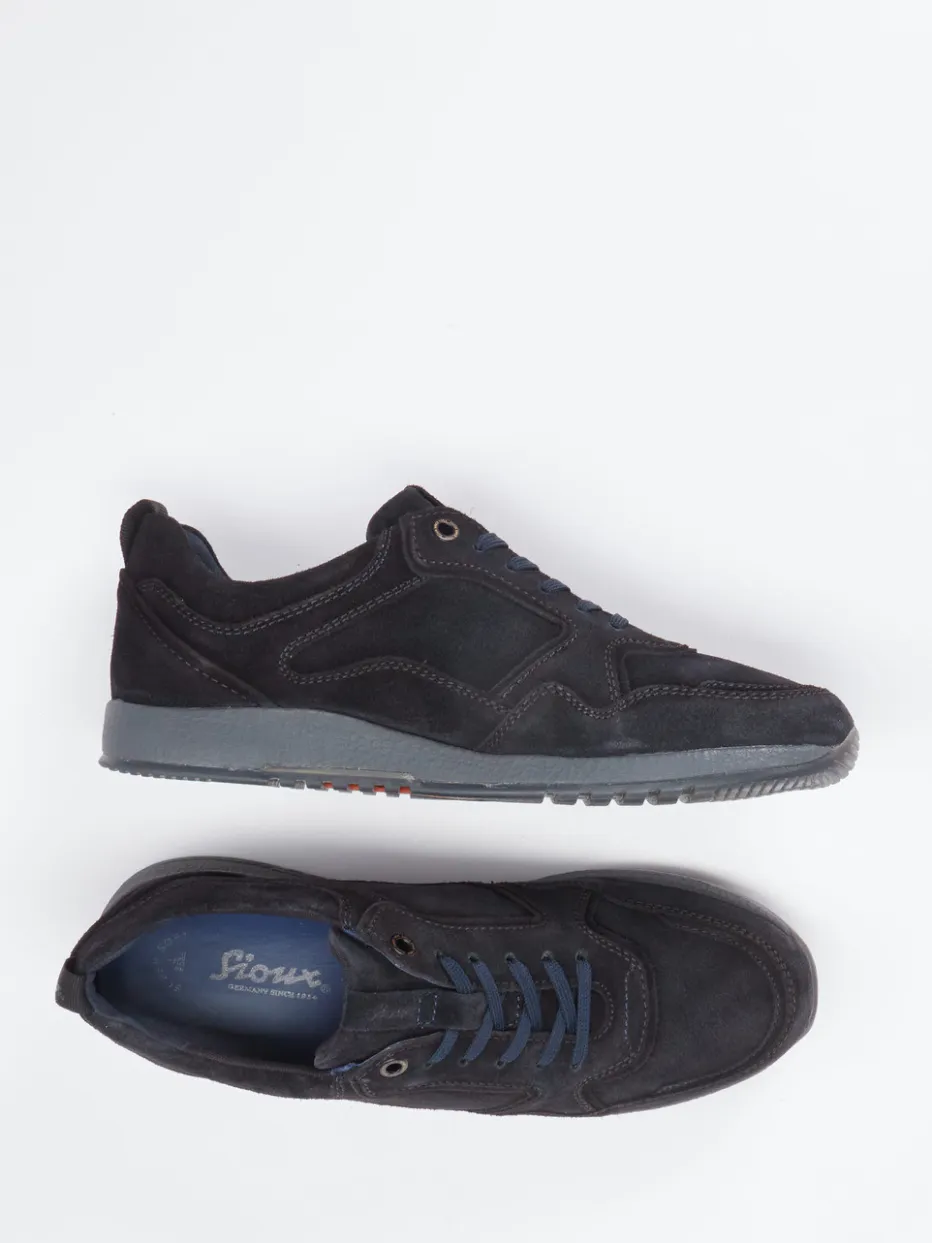 Sportiver Alltagskomfort trifft Retro-Charme.Sioux präsentiert einen Low-Top Sneaker für Herren, der Schlichtheit und Retro-Akzente vereint. Ideal für entspannte Tage und urbane Aktivitäten bietet dieser Sneaker aus nachtblauem Veloursleder mit samtig-matter Oberfläche ein angenehm weiches Tragegefühl. Die klassische, abgerundete Form wird durch die tonalen Steppnähte, Metallösen und dezente Farbdetails in Marineblau und Dunkelgrau stilvoll ergänzt. Die profilierte graue Gummisohle mit schwarzem Einsatz sorgt für rutschfesten Halt, während das gepolsterte Innenfutter aus Textil und ein herausnehmbares Lederfußbett zusätzlichen Komfort garantieren. Inspiriert vom Retro Runner Trend passt das Modell optimal zu Casual-Looks. Ein authentischer Freizeit-Sneaker mit hochwertiger Verarbeitung und ruhiger Farbgestaltung – ganz im Zeichen der Sioux-Handschrift.