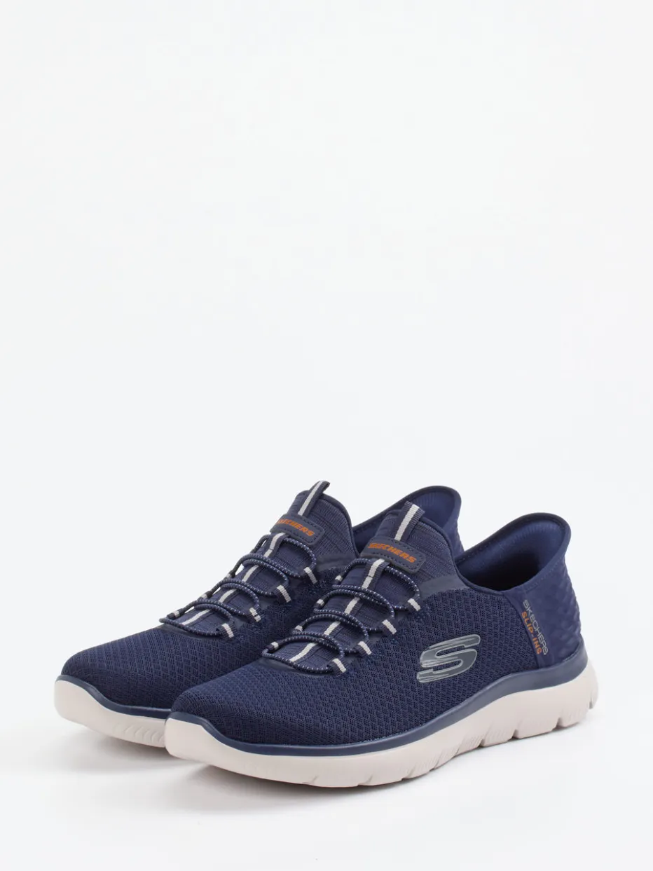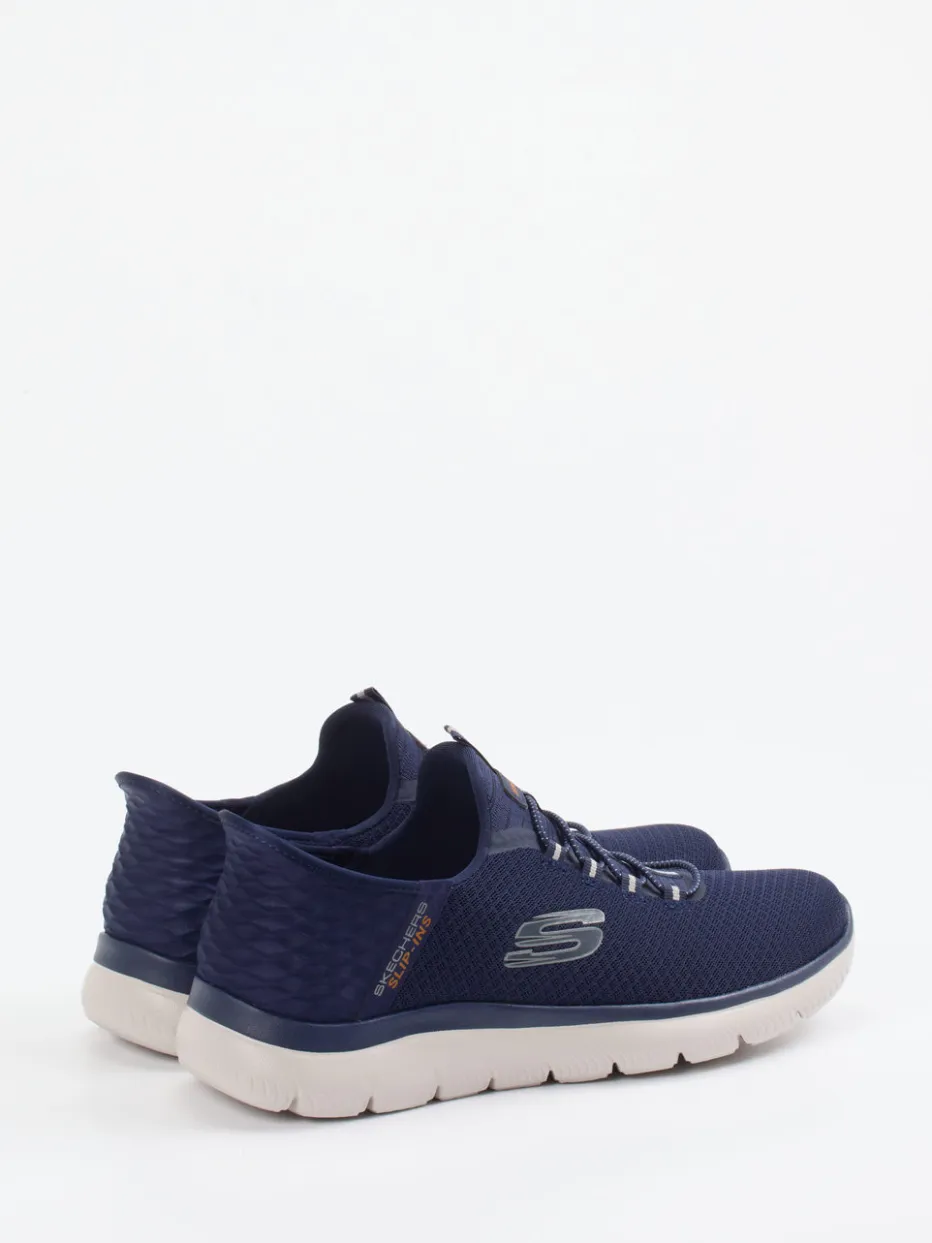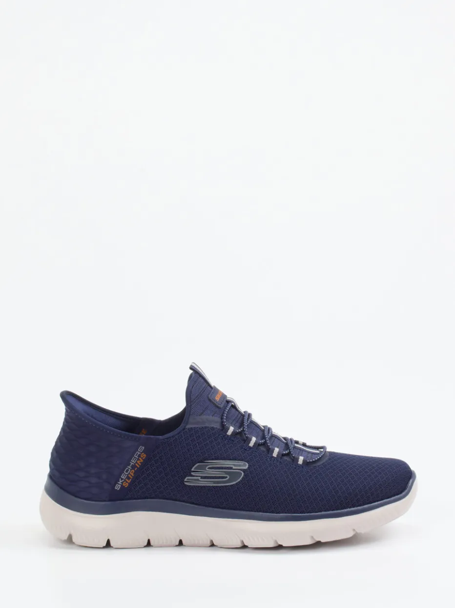 Sportlich leicht, den ganzen Tag.Skechers präsentiert mit diesem Herren-Sneaker einen komfortorientierten Slip-On für Alltag und Freizeit. Die navyblauen Slip-On Sneaker aus atmungsaktivem Mesh-Textil mit matter Oberfläche kombinieren minimalistische Optik mit funktionalem Aufbau. Elastische Schnürung und strukturierte Fersenkappe unterstützen den leichten Einstieg und sicheren Halt. Die Air-Cooled-Memory-Foam-Innensohle sorgt für Atmungsaktivität und Druckentlastung, während die profilierte Gummisohle das natürliche Abrollen fördert. Optische Highlights wie Kontrastakzente an Lasche und Schnürung sowie dezente Logo-Prints unterstreichen den sportiven Charakter. Ideal zu Jogpants oder Casual-Wear. Leichtigkeit und Komfort vereint im typischen Skechers-Design.