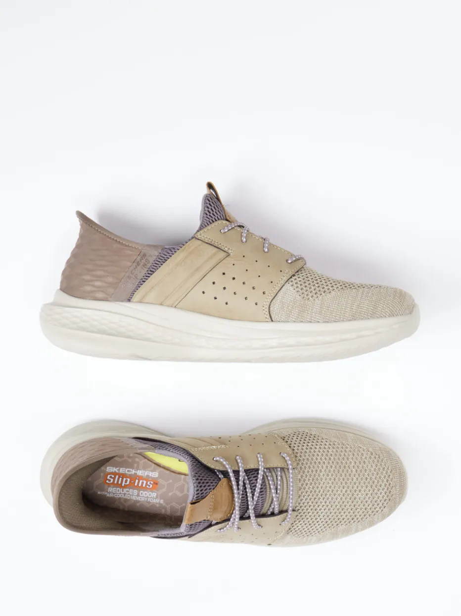 Komfort trifft Funktion.Der Herrensneaker von Skechers vereint sportliches Design mit praktischem Tragekomfort. Als Slip-On mit elastischem Einstieg und Mesh-Obermaterial bietet er maximale Bequemlichkeit im Alltag – sei es beim Stadtbummel oder zu Hause. Das atmungsaktive Textil wird von strukturiertem Veloursleder und dezenten Naturtönen ergänzt, während reflektierende Details und die rund-sportliche Silhouette für einen modernen Akzent sorgen. Die rutschhemmende Gummisohle und die gepolsterte Memory-Foam-Innensohle unterstützen den Fuß ergonomisch. Streetwear-Einflüsse machen diesen Schuh zum Favoriten der Athleisure-Ästhetik. Skechers überzeugt mit kompromisslosem Tragekomfort in stilvoll-reduzierter Optik.