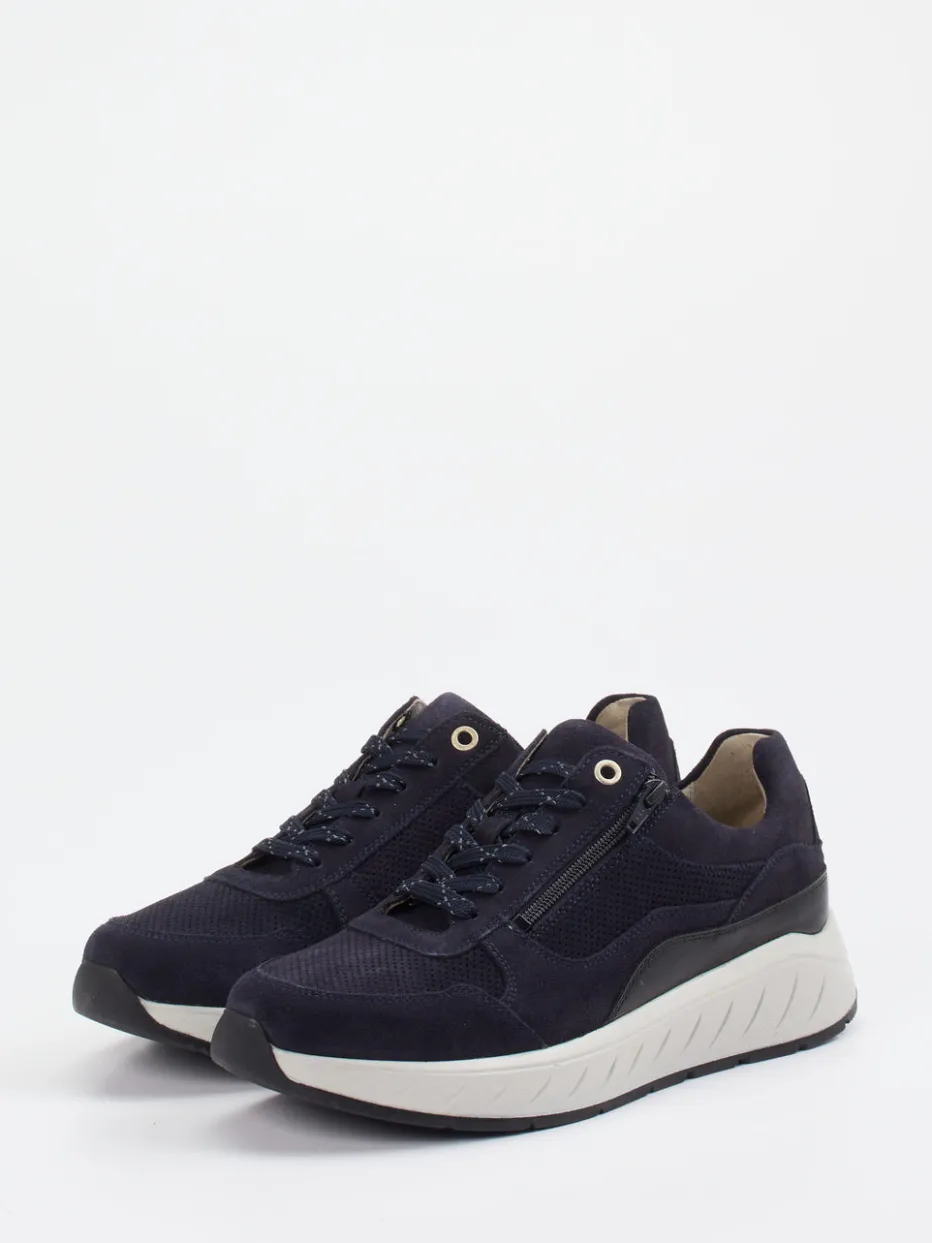 Für entspannte Wege mit Stil.Solidus präsentiert mit diesem Komfort-Sneaker ein Damenmodell für das tägliche Gehen mit maximalem Wohlgefühl. Das dunkelblaue Veloursleder ist samtig genarbt und wird durch perforiertes Mesh akzentuiert, wodurch ein angenehmes Fußklima entsteht. Die sportlich-voluminöse Silhouette samt ergonomischer Chunky-Sohle sorgt für eine sichere Bodenhaftung. Eine Schnürung mit Metallösen ergänzt den seitlichen Reißverschluss – ideal für schnelles An- und Ausziehen. Inspiriert vom Minimalismus passt der Sneaker perfekt in lässige Streetwear-Looks. Der weich gepolsterte Einstieg und die Luftpolstersohle bieten langlebigen Komfort im markentypischen Solidus-Stil.