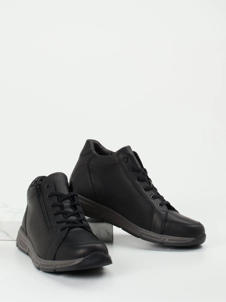 Für komfortorientierte Streetwear-Momente.Solidus präsentiert mit diesem schwarzen Mid-Top Sneaker ein Modell für komfortbewusste Herren. Ob für den Alltag in der Stadt oder entspannte Stunden zu Hause: Das atmungsaktive Kalbleder mit samtiger, matter Oberfläche und sanft strukturierter Mesh-Anmutung sorgt für angenehmes Fußklima. Mit knöchelhoher Silhouette, Ton-in-Ton Reißverschluss seitlich und klassischer Schnürung ist der Sneaker modern-minimalistisch gestaltet. Die rutschhemmende Gummisohle bietet Sicherheit, das gepolsterte Innenfutter wärmt – selbst an kühleren Tagen. Dank Weite K und herausnehmbarem Fußbett ideal für sensible Füße oder orthopädische Einlagen. Urban Utility trifft Komfort. Komfortkompetenz von Solidus – intelligent designt für Alltag und Anspruch.