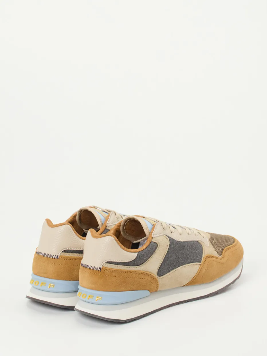 Style im Zeichen der 80er.THE HOFF BRAND interpretiert mit diesem Herren-Sneaker die klassische Runner-Silhouette mit modernem Twist. Für entspannte City- und Freizeitmomente designt, überzeugt das Modell mit einem edlen Materialmix aus samtig angeschliffenem Veloursleder, atmungsaktivem Mesh und filzartigem Textil. Warme Beige- und Brauntöne treffen auf Kontrastdetails in Hellblau und Gelb, während die strukturierte Gummisohle mit transluzenten Akzenten einen sicheren Tritt garantiert. Der gepolsterte Schaft und die verstärkte Fersenkappe unterstreichen den Komfortanspruch. Kombiniert mit Jogpants oder Jeans entsteht ein stilsicherer Streetstyle. Hoff steht hier für Designkompetenz und komfortorientierte Ästhetik.