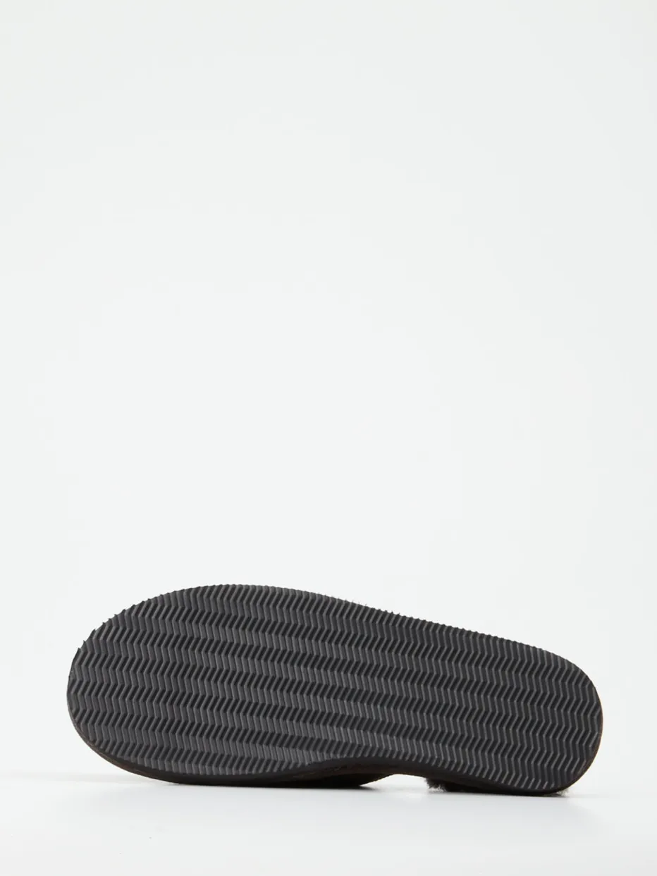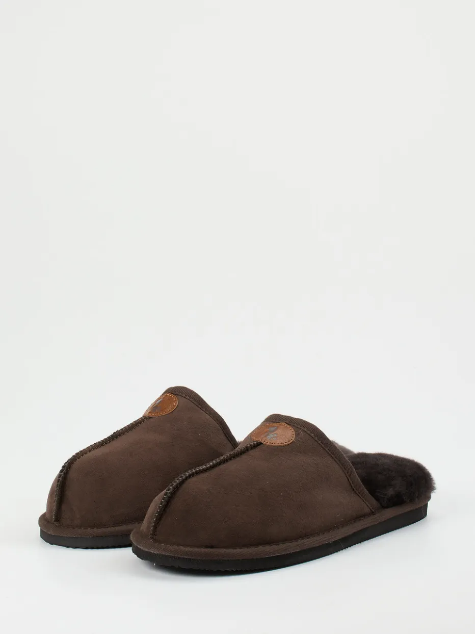 Behaglichkeit trifft auf Handwerkskunst.Thies präsentiert klassische Pantoffeln für Zuhause in hochwertiger Verarbeitung. Ob kalte Winterabende oder entspannte Loungewear-Momente am Wochenende – diese Pantolette aus dunkelbraunem Veloursleder mit samtig-matter Oberfläche sorgt für ein angenehm weiches Tragegefühl. Das naturbelassene Lammfellfutter umschließt den Fuß mit wohltuender Wärme. Die schlupffreundliche Silhouette mit offener Ferse wird durch eine schwarze, leicht profilierte Gummisohle ergänzt, die Trittsicherheit auf allen Untergründen bietet. Dezente Ton-in-Ton-Nähte und ein geprägter Leder-Logo-Patch runden das Design harmonisch ab. Ideal zu weichen Fleecehose oder Strick. Ein wohliges Trageerlebnis mit stilvollem Anspruch – typisch Thies.