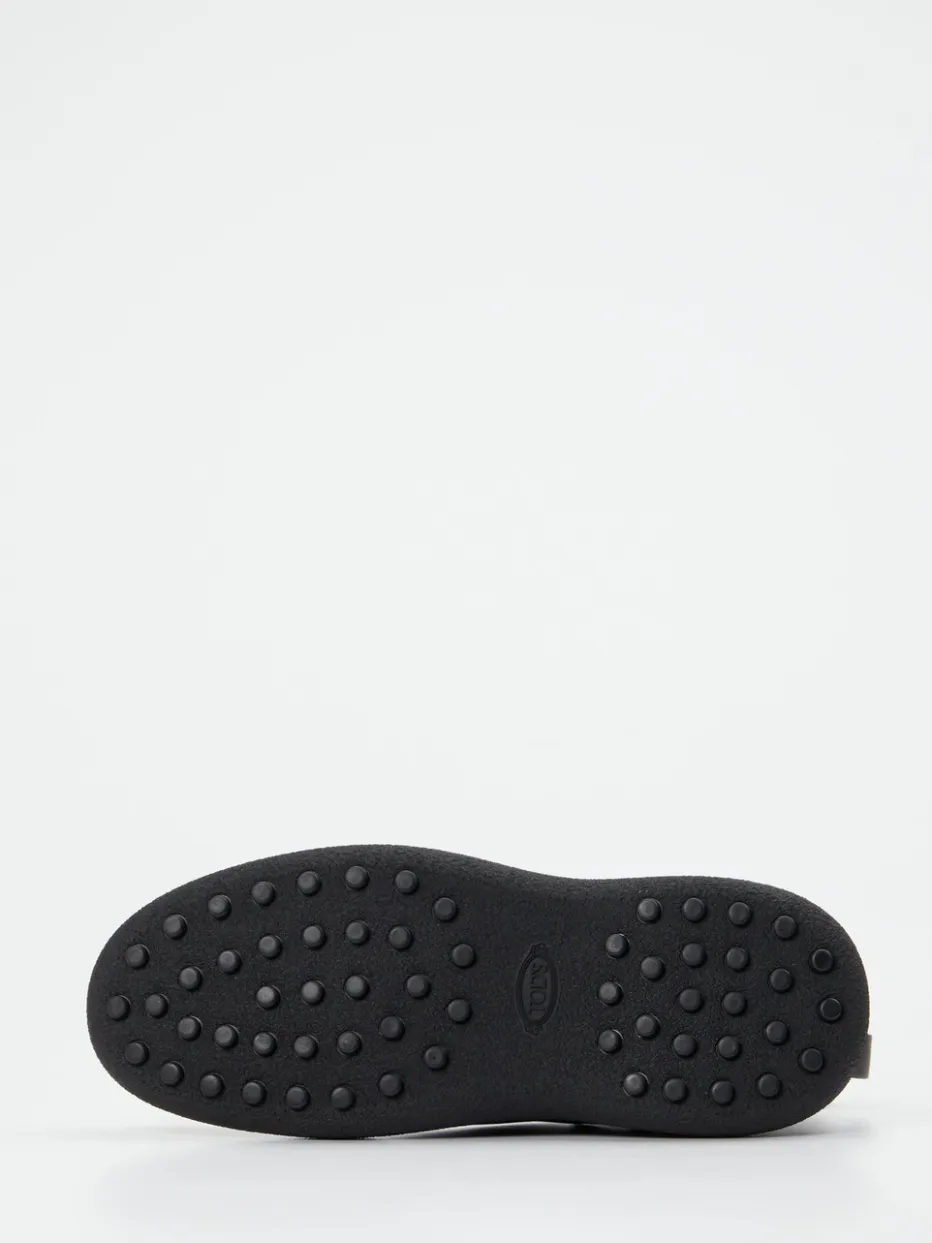 Minimalistischer Klassiker in Neuinterpretation.Tod’s präsentiert formschöne Chelsea Boots für Herren und Damen, gefertigt aus hochwertigem Kalbleder mit sanft glänzender Oberfläche. Ob im Büroalltag oder im urbanen Umfeld: Das klassische, knöchelhohe Design mit seitlichem Elastikeinsatz und Zuglasche erleichtert das An- und Ausziehen. Schwarzes Kalbleder trifft auf eine profilierte Gummisohle mit markanten Noppen, die nicht nur optisch auffällt, sondern auch sicheren Halt bietet. Dezente Details wie Ton-in-Ton-Nähte und das geprägte Logo unterstreichen den minimalistischen Charakter. Stilistisch bewegt sich dieser Boot zwischen zeitlosem Luxus und aktuellen Quiet-Luxury-Trends. Verlässlicher Komfort und eleganter Purismus – typisch Tod’s.