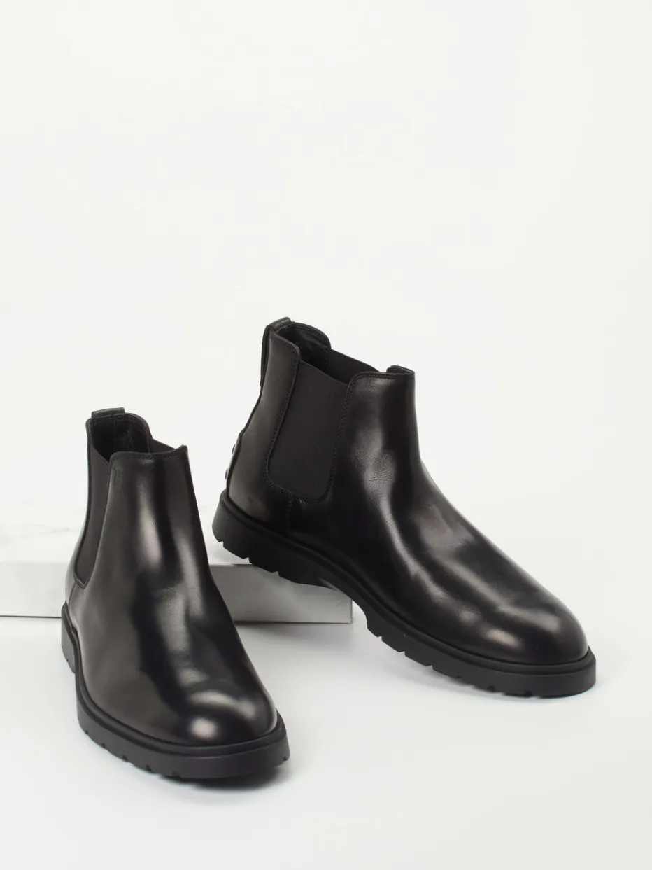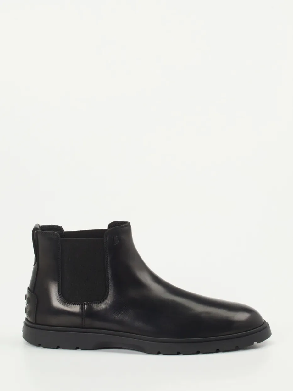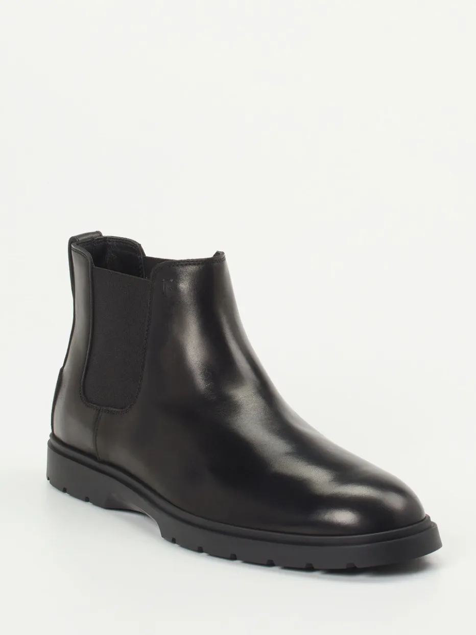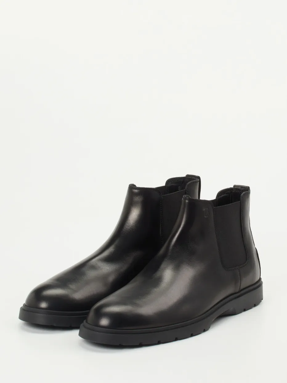 Understatement aus edlem Leder.Die Marke Tod’s zeigt mit diesen Herren-Chelsea-Boots eine stilvolle Interpretation zeitloser Klassiker. Ob im Office oder beim Stadtbummel – das schwarze, fein glänzende Kalbleder verleiht jedem Auftritt eine souveräne Note. Die klassische, knöchelhohe Silhouette wird durch tonige Elastikeinsätze und eine dezente Zuglasche ergänzt. Komfort und Langlebigkeit verspricht die robuste Gummisohle mit geprägter Noppenstruktur und Markenemblem. Dank minimalistischem Design und hochwertiger Verarbeitung passen die Boots perfekt zu angesagten Business-Casual-Looks. Dezente Eleganz und tradierte Handwerkskunst zeichnen diesen Herrenschuh der Luxusmarke Tod’s aus.