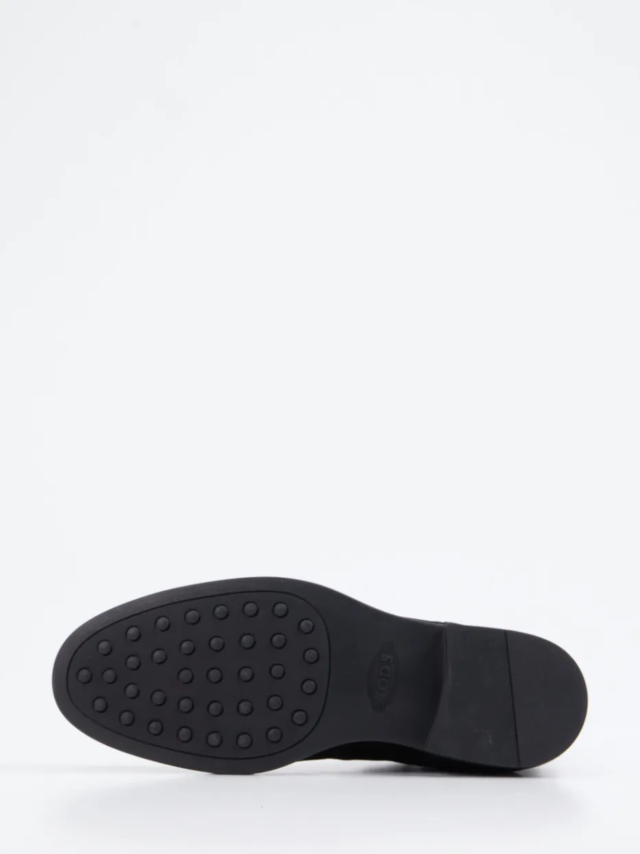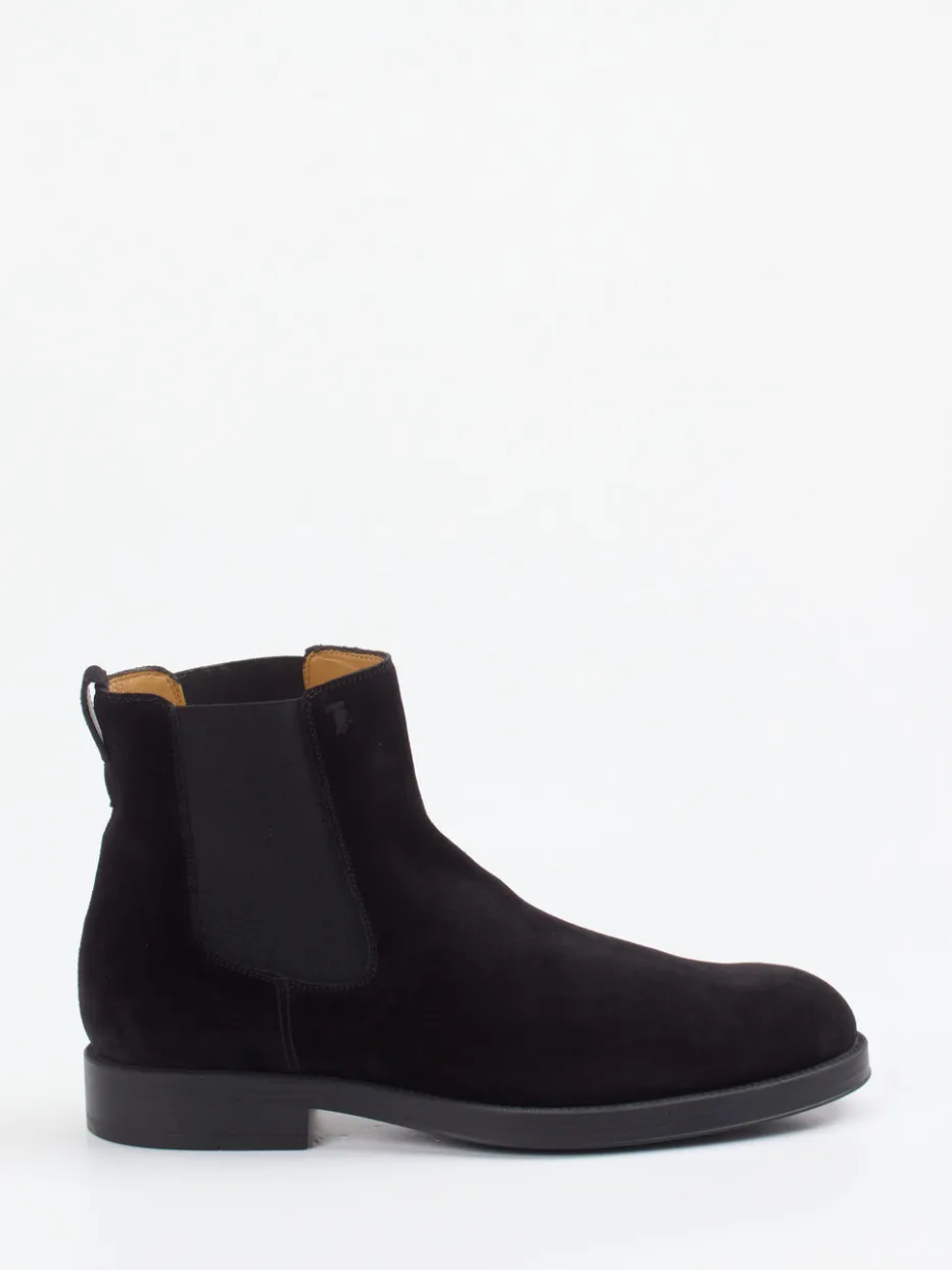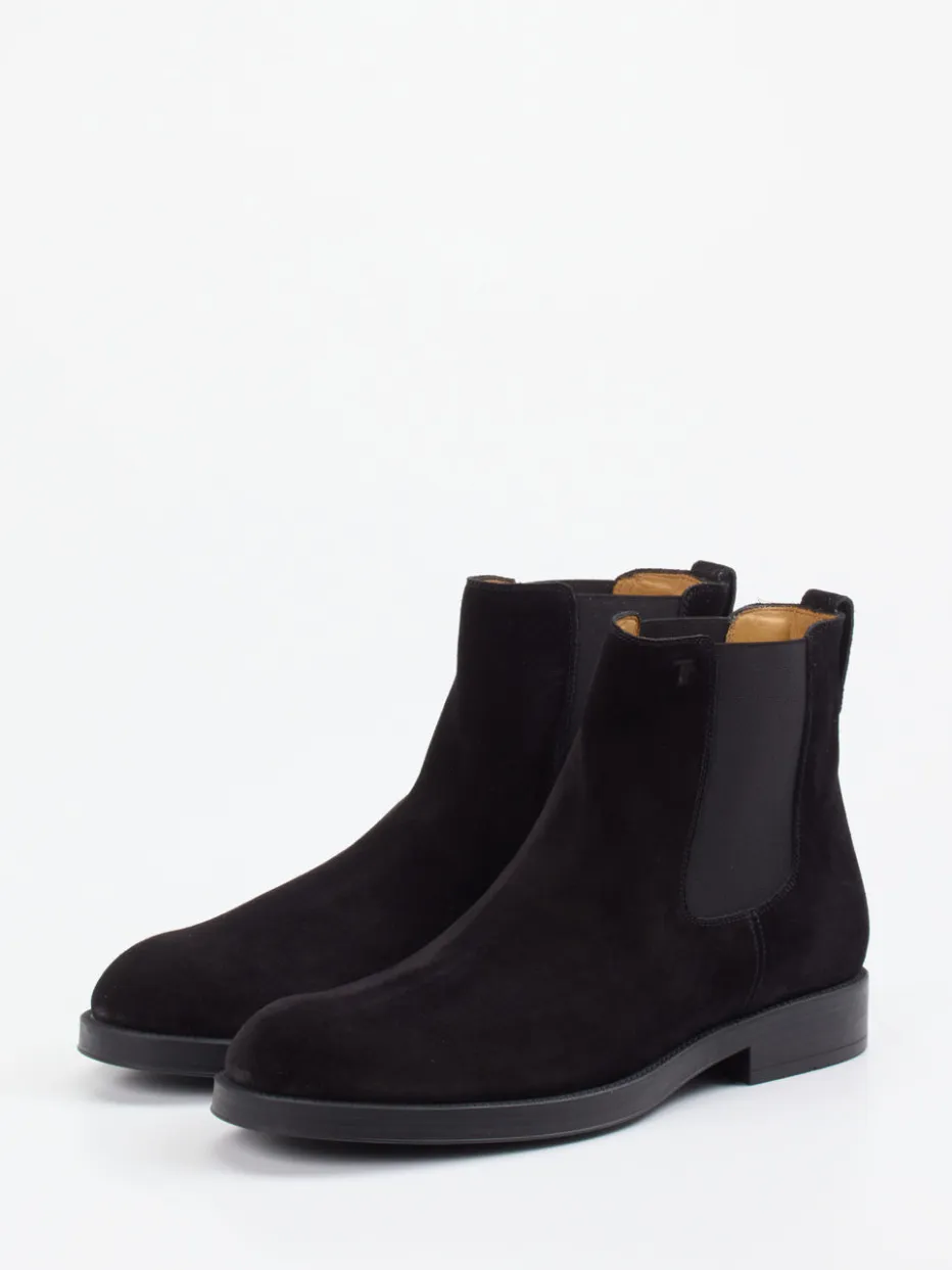 Puristische Eleganz in Velours.Tod’s zeigt mit diesen Herren-Chelsea Boots aus schwarzem Veloursleder eine meisterhafte Interpretation eines zeitlosen Klassikers. Für Geschäftstermine im Büro wie auch stilvolle Freizeitauftritte – die klassische, knöchelhohe Form aus samtig angeschliffenem Veloursleder überzeugt durch klare Linien und dezente Designdetails. Tonige Elastikeinsätze und eine rückseitige Zuglasche sorgen für komfortables Anziehen, das weiche Lederfutter garantiert ein angenehmes Tragegefühl. Die profilierte Gummisohle mit Markenprägung verleiht Trittsicherheit, ideal für Herbst und Winter. Stilistisch verankert im Trend „Quiet Luxury“, passt das Modell zu Kaschmirmantel und Lederhandschuhen. Ein Chelsea Boot mit italienischer Handschrift – souverän im Ausdruck, kompromisslos in der Qualität.