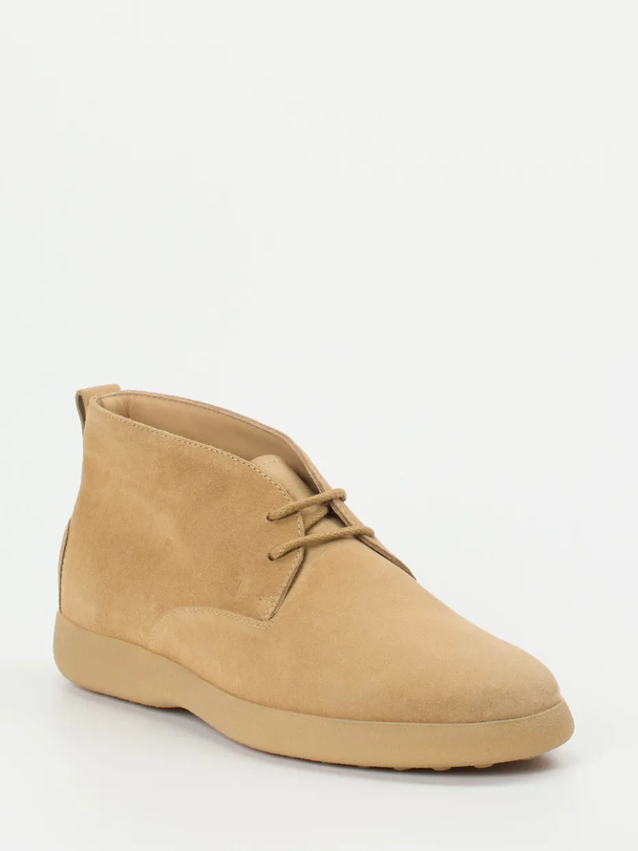 Formvollendung trifft Minimalismus.Die Marke Tod’s präsentiert mit diesen Desert Boots einen Herren-Klassiker in modern zurückhaltender Interpretation. Ideal für Übergangstage im urbanen Alltag bietet der schnürbare Boot dank seines samtig angeschliffenen Veloursleders in sandbeigem Ton angenehmen Tragekomfort und vielseitige Kombinierbarkeit. Die knöchelhohe, rund zulaufende Silhouette wird durch eine tonale Schnürung und dezente Logoprägung akzentuiert. Die profilierte Gummisohle mit typischen Noppendetails sorgt für sicheren Stand und ein klares Stilstatement. Die weiche Lederfütterung und das lederbezogene, herausnehmbare Fußbett ergänzen den premium Tragekomfort. Stilistisch passt das Modell in den „Quiet Luxury“-Trend und ergänzt smarte Casual-Outfits wie auch Office-Looks mühelos. Ein hochwertiger Begleiter im gepflegten Understatement der Marke Tod’s.