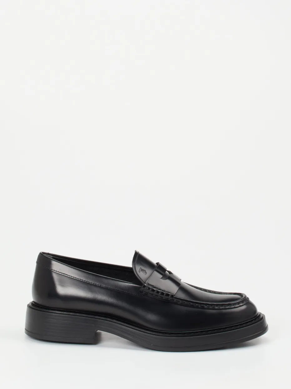 Schwarzes Kalbleder mit glänzendem Finish und profilierter Gummisohle verbinden sich in diesem Loafer von Tod’s zu einer markanten Silhouette mit raffiniertem Detailreichtum.