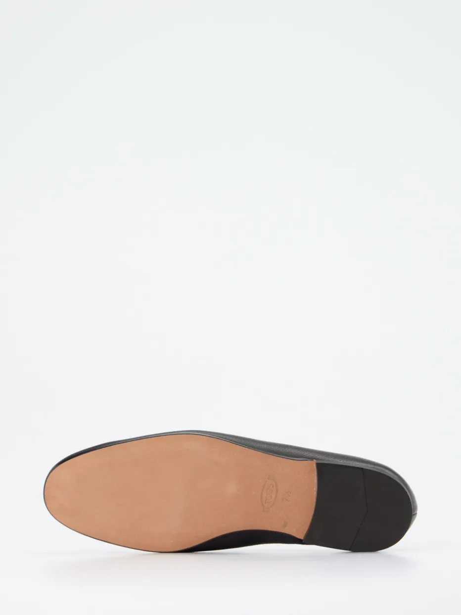 Schlichte Eleganz für jeden Tag.Tod’s präsentiert einen edlen Herren-Loafer aus feinem, schwarz genarbtem Kalbleder. Ideal für formelle Termine oder stilvolle Alltagslooks: Dieser Slipper verbindet italienisches Design mit zurückhaltendem Luxus. Das hochwertige Obermaterial aus Kalbleder zeigt sich mit einer tonalen Mokassinnaht und einer filigranen Prägung auf dem Zier-Riemen. Eine klassische, schmale Silhouette und die flache Ledersohle mit dezentem Gummieinsatz unterstreichen den puristischen Charakter. Der Schlupf-Einstieg erleichtert das Anziehen, während das gepolsterte Lederfutter für Bequemlichkeit sorgt. Ein zeitloser Loafer mit markentypischer Raffinesse im Zeichen leiser Eleganz.