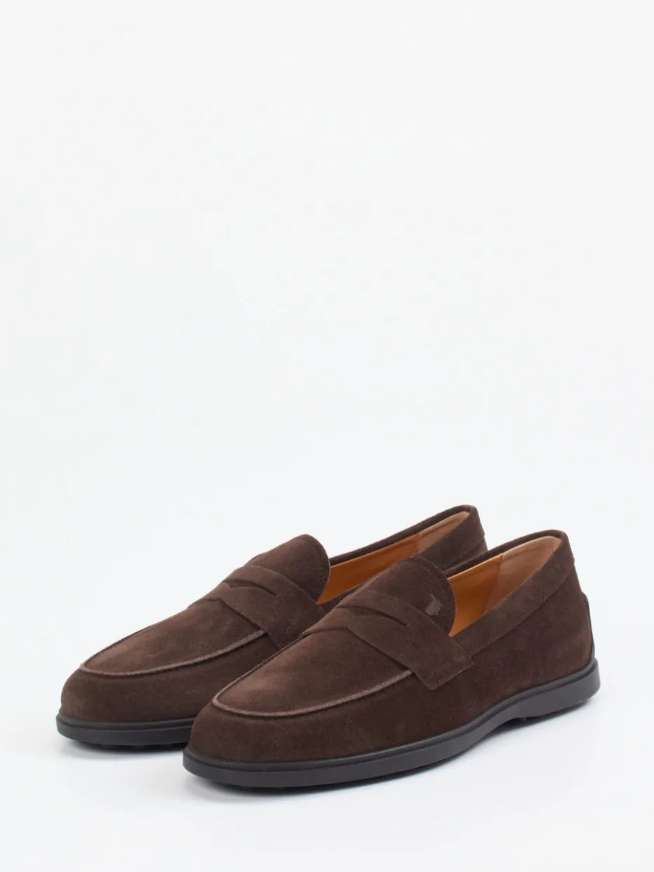 Understatement mit Format.Tod’s präsentiert mit diesem Herrenloafer ein Modell, das dezente Eleganz in den Alltag bringt. Ideal für entspannte Office-Tage oder stilvolle City-Walks: Der Slipper aus dunkelbraunem Veloursleder zeigt sich samtig-matt und bietet dank klassischer Silhouette und Penny-Strap einen souveränen Auftritt. Die profilierte Gummisohle mit geprägtem Logo sorgt für Stabilität und Komfort. Ton-in-Ton-Nähte und ein edles Lederfutter unterstreichen das cleane Design. Inspiriert von der Preppy-Ästhetik vergangener Jahrzehnte, passt er zu Chinohose und Pullover ebenso wie zu Soft Tailoring. Ein authentisches Statement für leise Luxusmomente mit langer Tradition.
