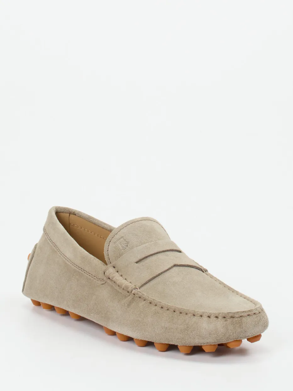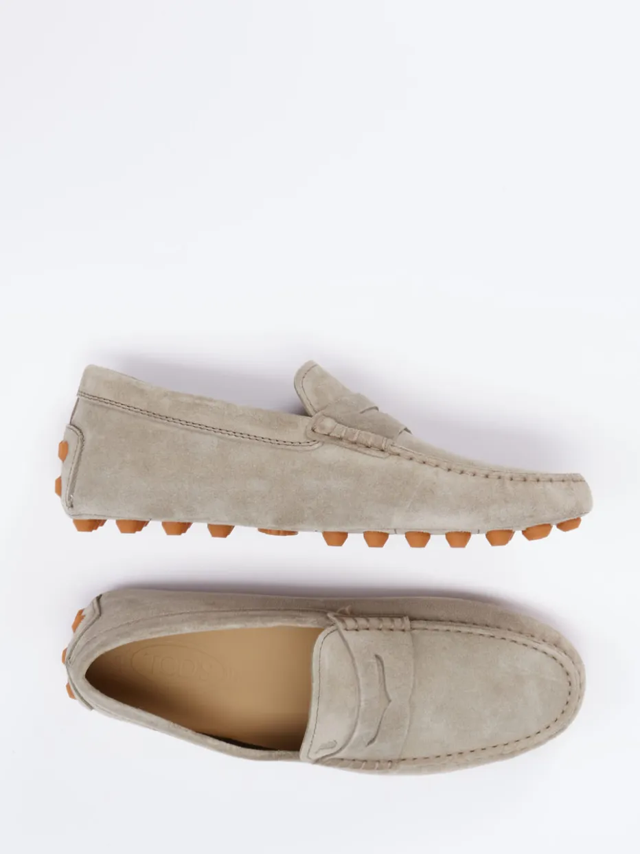 Sommerlicher Chic in edlem Velours.Tod’s präsentiert mit diesem Herren-Mokassin eine stilvolle Freizeitoption mit italienischem Flair. Die flache Silhouette und der komfortable Schlupfeinstieg machen ihn ideal für sommerliche Spaziergänge oder Reisen. Gefertigt aus beigegrauem, samtig angeschliffenem Veloursleder, besticht das Modell mit Ton-in-Ton-Nähten, klassischer Mokassinnaht und einer geprägten Logo-Prägung auf dem Blatt. Die durchgenähte Gummi-Stollensohle sorgt für Rutschfestigkeit und ein dynamisches Laufgefühl. Die Leder-Innenausstattung verspricht atmungsaktiven Tragekomfort. Ideal kombinierbar mit hellen Chinos und leichten Leinenhemden. Ein Herrenschuh, der souveräne Eleganz und diskreten Luxus verkörpert – typisch Tod’s.