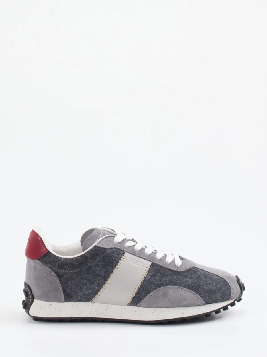 Streetwear trifft dezente Eleganz.Tod’s präsentiert einen Retro-inspirierten Lifestyle-Sneaker in der Kategorie Herren. Für urbane Styles mit Vintage-Flair bietet das Modell eine ausgewogene Kombination aus anthrazitfarbenem Veloursleder und weichem Textilfilz mit matter Oberfläche. Der schmal geschnittene Sneaker setzt Akzente mit einem dunkelroten Fersenpatch, einer gesprenkelten Zwischensohle und dem seitlich geprägten Markenlogo. Die flache Gummisohle mit markentypischer Noppenstruktur bietet sicheren Tritt und ein dezentes Streetwear-Statement. Perfekt kombinierbar mit schmaler Bomberjacke oder monochromen Looks. Stilvoller Komfort mit Signatur-Charakter von Tod’s.