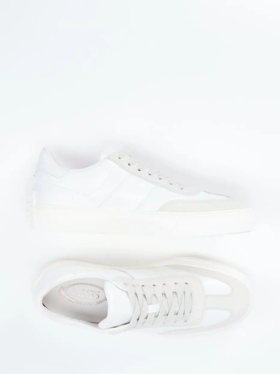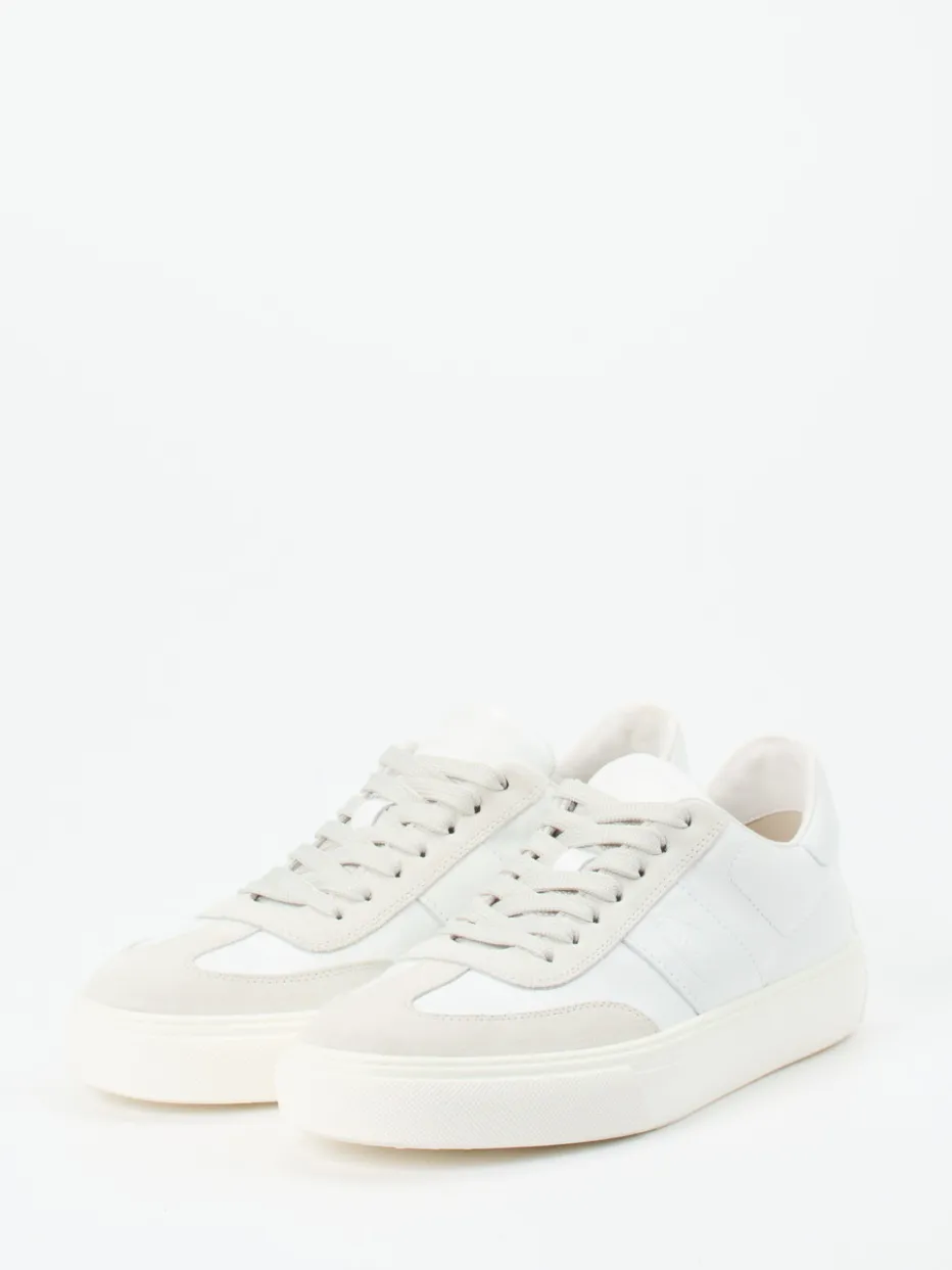 Dezenter Stil mit urbaner Leichtigkeit.Tod’s präsentiert mit diesem Low-Top-Sneaker ein Modell für stilbewusste Puristen. Ideal für Alltag, Freizeit und Business-Casual kombiniert der Sneaker weiches Kalbleder mit samtig angeschliffenem Veloursleder in Off-White und Hellgrau. Die klassische Rundform, tonale Schnürung und eine geprägte Fersenverstärkung mit markanter Noppenstruktur prägen das reduzierte Design. Eine strukturierte Gummisohle mit Fischgrät-Profil sorgt für Bodenhaftung, während das weiche Innenfutter und das herausnehmbare Fußbett funktionalen Komfort bieten. Inspiriert von Quiet Luxury und Streetwear-Klassikern der Saison. Ein dezenter Premium-Sneaker für stilsichere Kombinationen und urbanen Minimalismus.