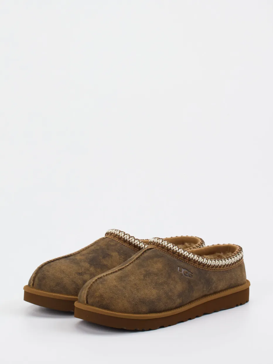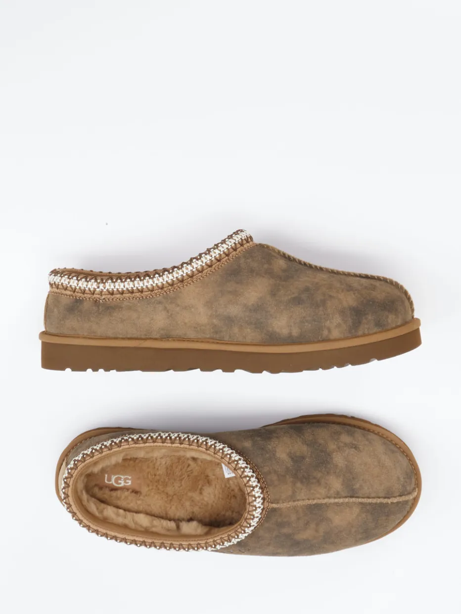 Wärme trifft lässige Ästhetik.UGG präsentiert klassische Hausschuhe aus der Kategorie Lammfell-Pantoffeln. Ideal für entspannte Tage daheim oder den Weg zum Briefkasten: Das Modell ist aus hochwertigem Veloursleder gefertigt, dessen samtig-matte Oberfläche durch ein warmes Mittelbraun unterstrichen wird. Ein naturbelassenes Lammfellfutter sorgt für wohlige Wärme, während die robuste Gummisohle mit Profil auch draußen zuverlässigen Halt bietet. Auffällig: die kontrastierende Textilborte entlang des Schaftrands. Die offene Ferse und die Schlupfform ermöglichen ein schnelles Anziehen. Modisch bewegen sich die Pantoffeln zwischen „Quiet Luxury“ und „Gorpcore“. Ein UGG-Klassiker, der Komfort mit unaufdringlichem Stil verbindet.