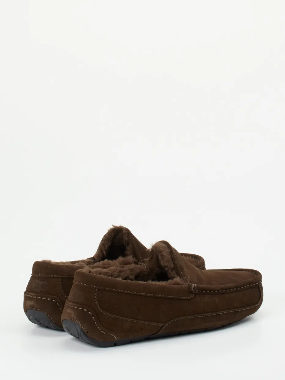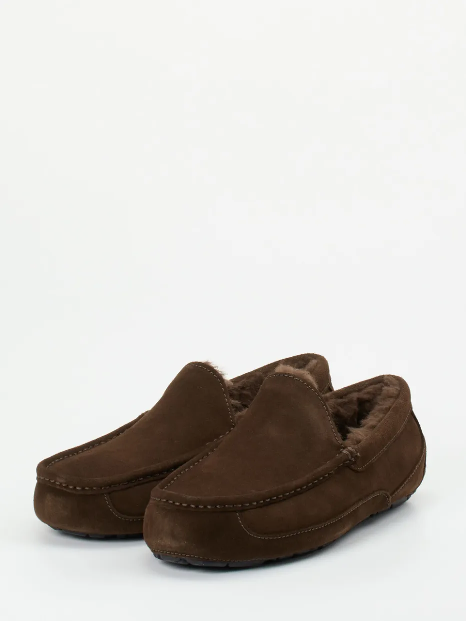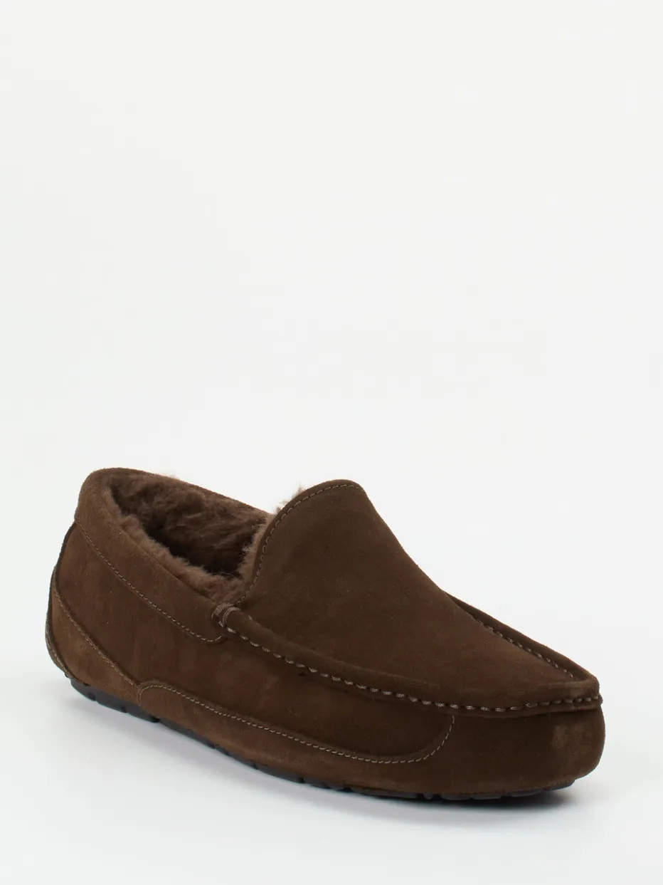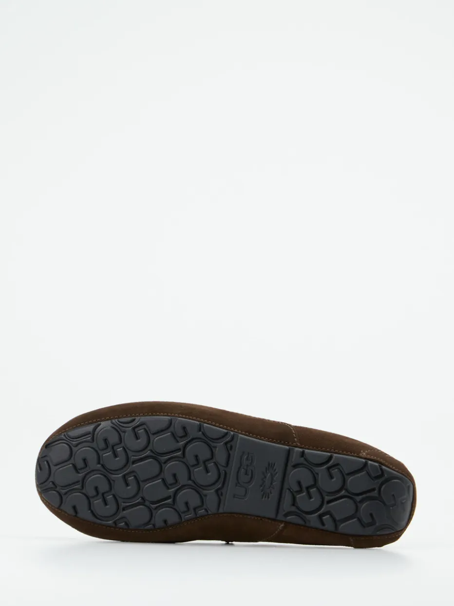 Komfort trifft ikonisches Design. UGG präsentiert mit diesem Mokassin-Hausschuh ein wohltuend warmes Modell für Herren. Perfekt für entspannte Stunden zu Hause: Der aus dunkelbraunem Veloursleder gefertigte Hausschuh überzeugt durch seine matte Oberfläche und tonale Ziernähte. Das innenliegende, dichte Lammfell sorgt für angenehme Wärme, während die flexible Gummisohle mit rutschhemmender Beschichtung auch kurze Wege nach draußen mitmacht. Der lässige Schlupfeinstieg und die klassische Form unterstreichen den wohnlichen Loungewear-Look. Ideal zur Kombination mit Hausanzug oder Bademantel an kalten Tagen. UGG vereint traditionelle Mokassin-Form mit funktionalem Kuschelkomfort.