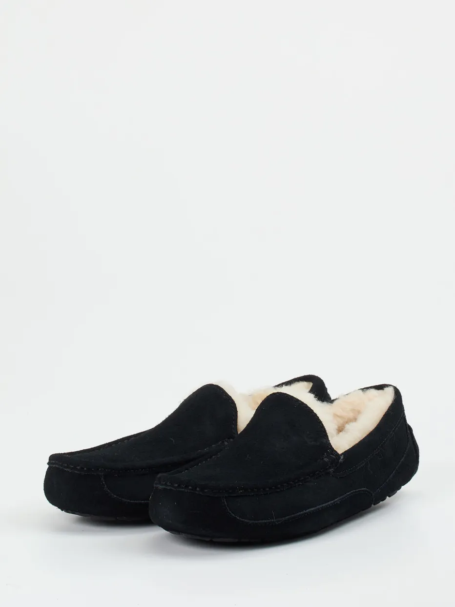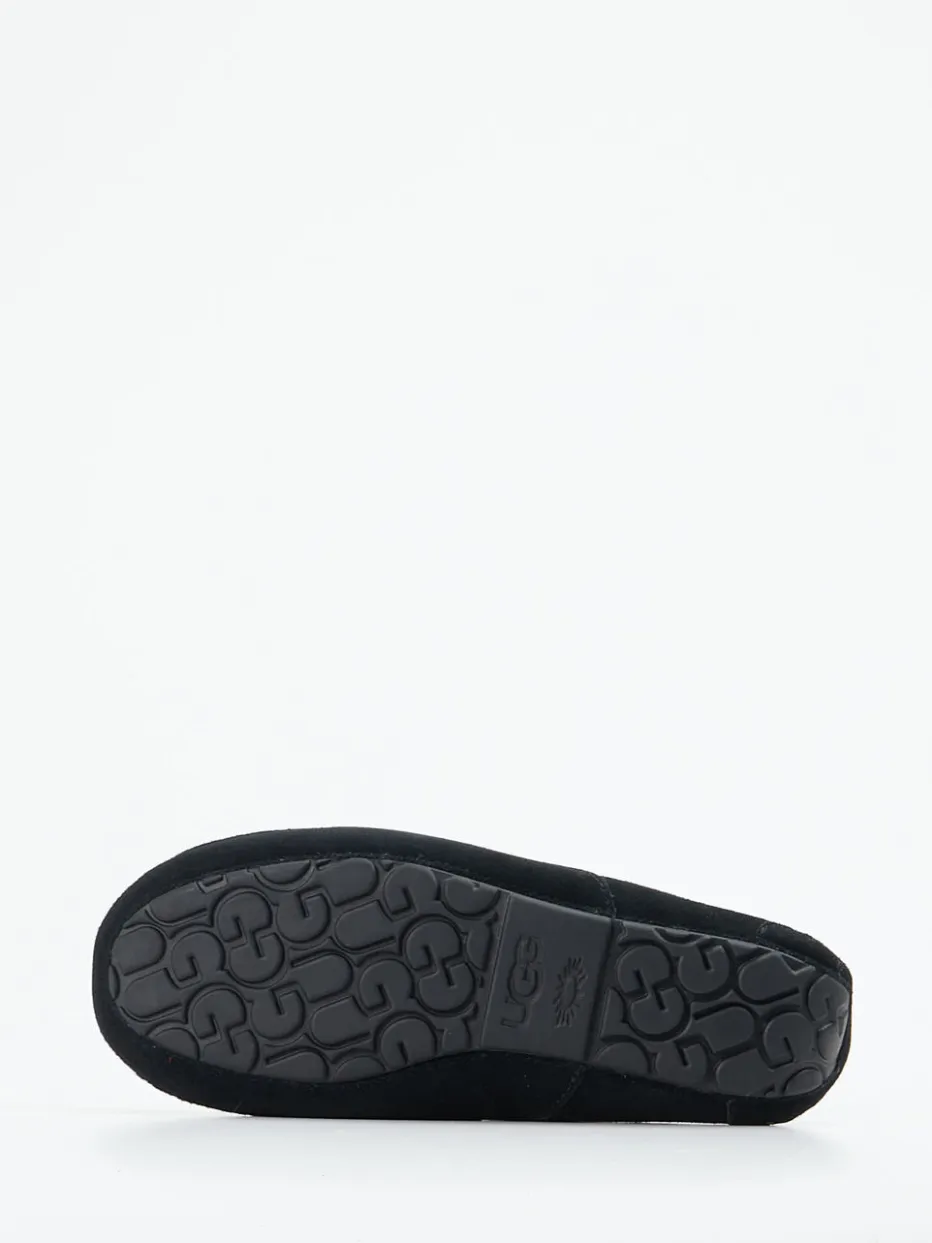 Warme Geborgenheit in stilvollem Gewand.UGG interpretiert mit diesem Herrenschuh die Kategorie Hausschuh neu. Ideal für entspannte Stunden zu Hause sorgt das samtig-matte schwarze Veloursleder mit tonalen Steppnähten für eine ruhige Optik und angenehme Haptik. Vollständig mit dichtem, cremeweißem Lammfell gefüttert, bietet der Mokassin-Slipper wohlige Wärme. Die flache Silhouette in Schlupfform erlaubt schnelles Anziehen, während die gummierte Laufsohle mit Profil auch kurze Wege nach draußen meistert. Inspiriert vom skandinavischen Komfortstil trifft dieser Schuh den Cozy-Core-Trend der Saison. Die Kombination mit edler Loungewear oder Softknit ist besonders harmonisch. Ein stilvoller Wohlfühlbegleiter mit funktionalem Anspruch und UGG-Komfort.