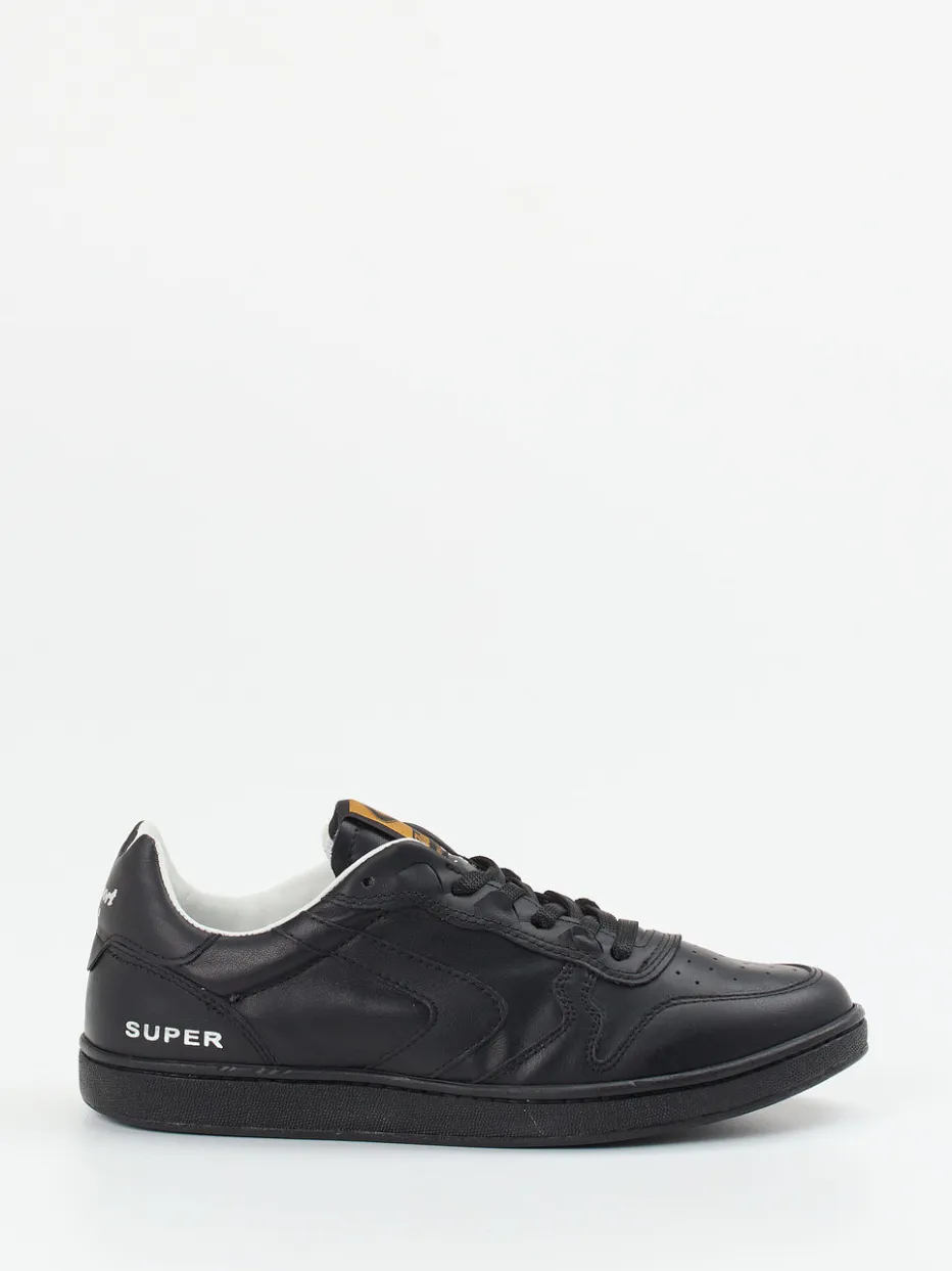 Schwarzes Kalbleder mit matter Oberfläche trifft auf kontrastierendes Weißfutter und goldfarbene Akzente auf der Zunge. Praktische Schnürung, ein gepolsterter Einstieg sowie ein herausnehmbares Fußbett betonen den Komfort. Die klassische Silhouette und der silberfarbene „SUPER“-Schriftzug an der Ferse verleihen dem Modell Retro-Charakter. Ideal für urbane Casual-Looks und stille Streetwear-Statements in der Cool-Season.