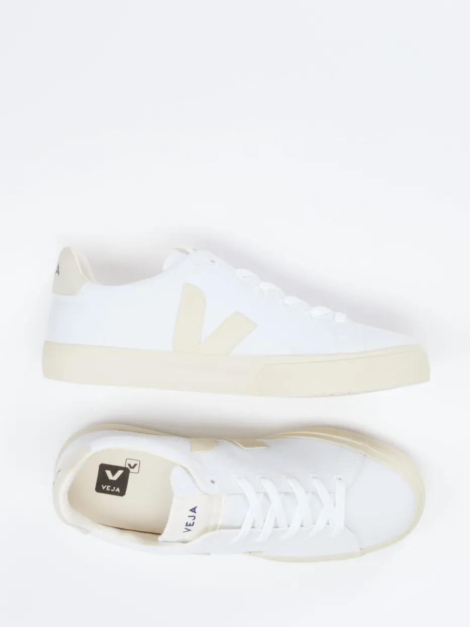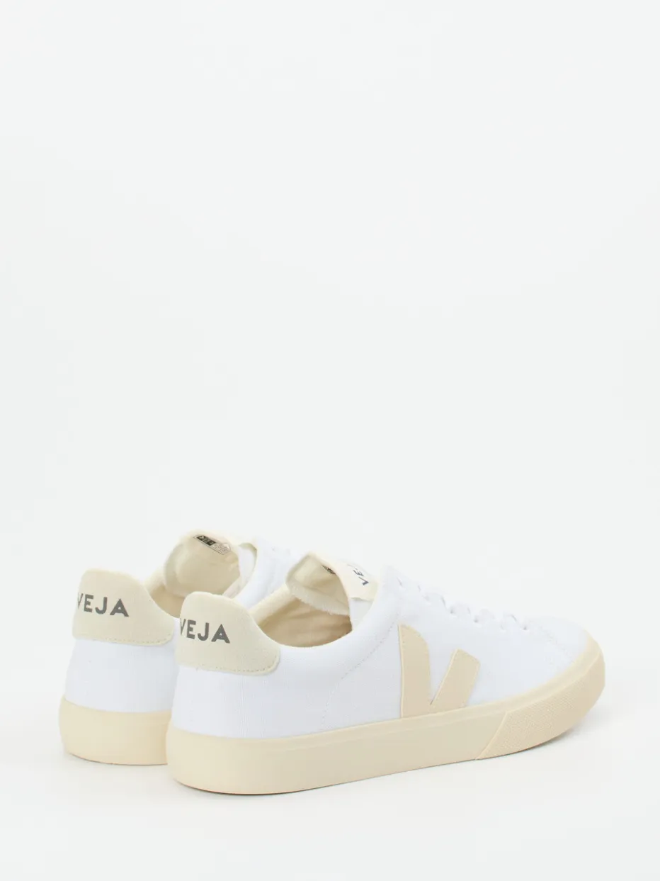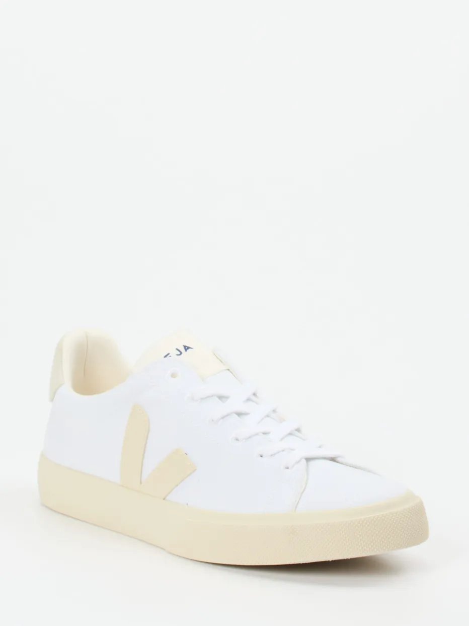 Stilvoller Minimalismus für jeden Tag.Veja bringt mit diesem Low-Top Sneaker eine Kombination aus nachhaltiger Canvas-Leinwand und klarem Design in den Alltag. Die weiße Oberfläche mit mattem Finish betont die klassische Silhouette, während ein sandfarbener Fersenbesatz aus samtig anmutendem Wildleder dezente Akzente setzt. Tonale Logoapplikationen, eine cremefarbene Gummisohle und V-Overlays bestimmen das Erscheinungsbild. Ausgestattet mit gepolstertem Textilfutter und Schnürverschluss passt das Modell zum Streetwear-Trend „Quiet Luxury“ ebenso wie zum Eco-Conscious-Lifestyle. Ideal zu leichten Chinos oder Canvas-Taschen kombinierbar. Nachhaltigkeit trifft bei Veja auf zeitlose Ästhetik und bewussten Komfort.