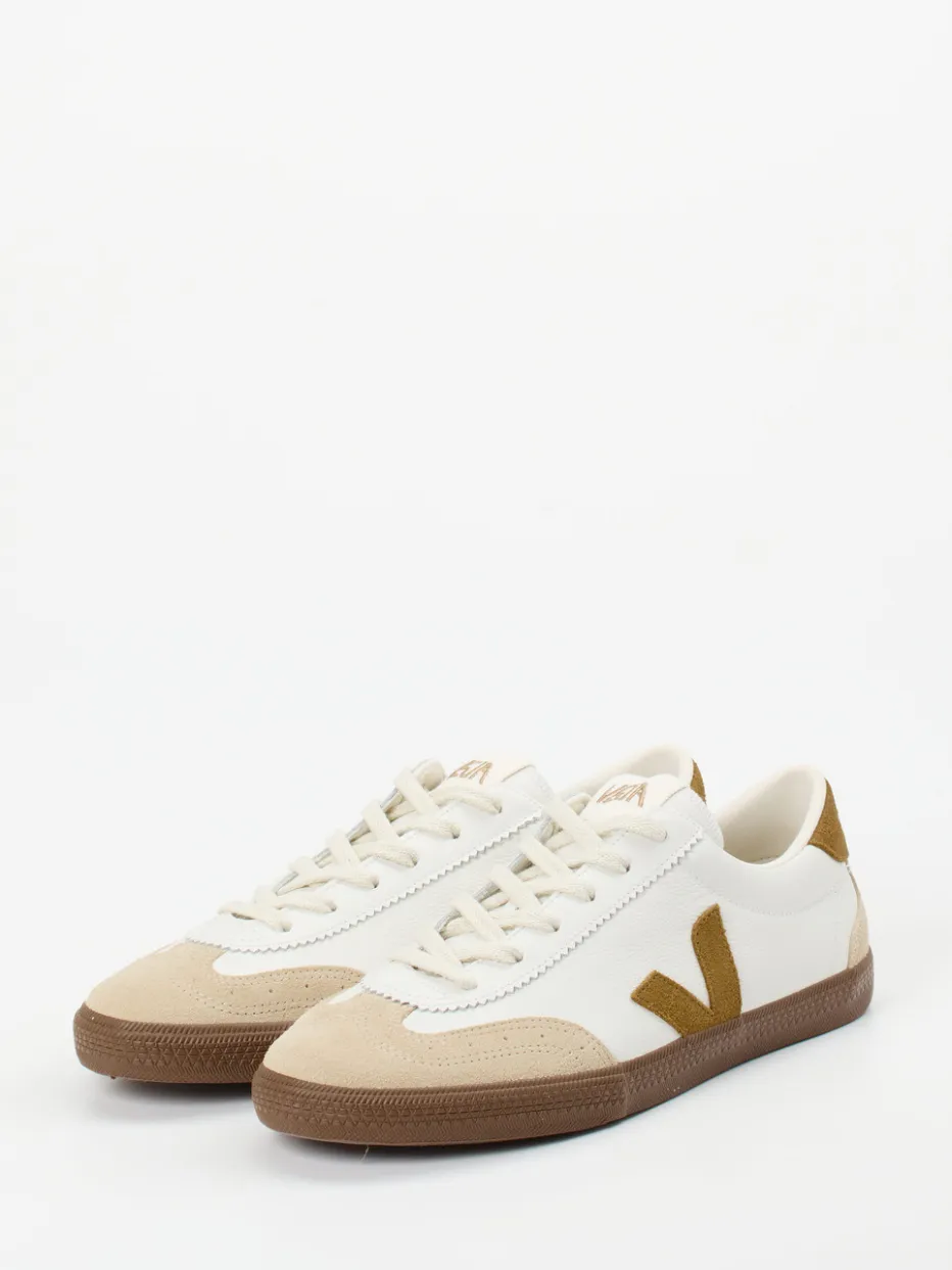 Reduzierter Stil für urbane Looks.Die Marke VEJA steht für Nachhaltigkeit und minimalistisches Design – dieser Sneaker macht beides sichtbar. Ob beim Stadtbummel oder im Büroalltag: Das Modell aus weißem Glattleder erhält durch beigefarbene Veloursleder-Applikationen und ein cognacbraunes V-Logo eine warme, retro-inspirierte Note. Die flache Silhouette mit runder Form, robuste braune Gummisohle und Textilfutter sorgen für angenehmen Tragekomfort. Schnürung, verstärkte Zehenpartie und das klare, unifarbene Finish unterstreichen den sportiv-reduzierten Charakter. Ein modernes Essential im Zeichen des „Quiet Luxury“-Trends – perfekt zu Naturtönen, Canvas oder Denim. Nachhaltigkeit mit Stil – VEJA schafft den zeitlosen Spagat.