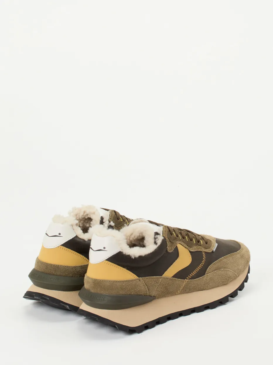 Stilvoll durch die kalte Saison.Voile Blanche liefert mit diesem Winter-Sneaker einen robusten Begleiter für Outdoor und Alltag. In klassischer Runner-Form gestaltet, verbindet das Modell khakifarbenes Veloursleder mit gewachstem Textil und glattem Kunstleder in Senfgelb und Weiß. Die genarbte Oberfläche, kontrastreiche Ziernähte und farbige Overlays spiegeln aktuelle Color-Blocking-Trends wider. Warmes Lammfellfutter schützt zuverlässig vor Kälte, während die beigefarbene Gummisohle mit tiefem Profil auch abseits befestigter Wege sicheren Halt gibt. Die solide Schnürung rundet den Look funktional ab. Ein ausgesprochen durchdachter Sneaker mit Markencharakter – komfortorientiert, trendbewusst, winterfest.