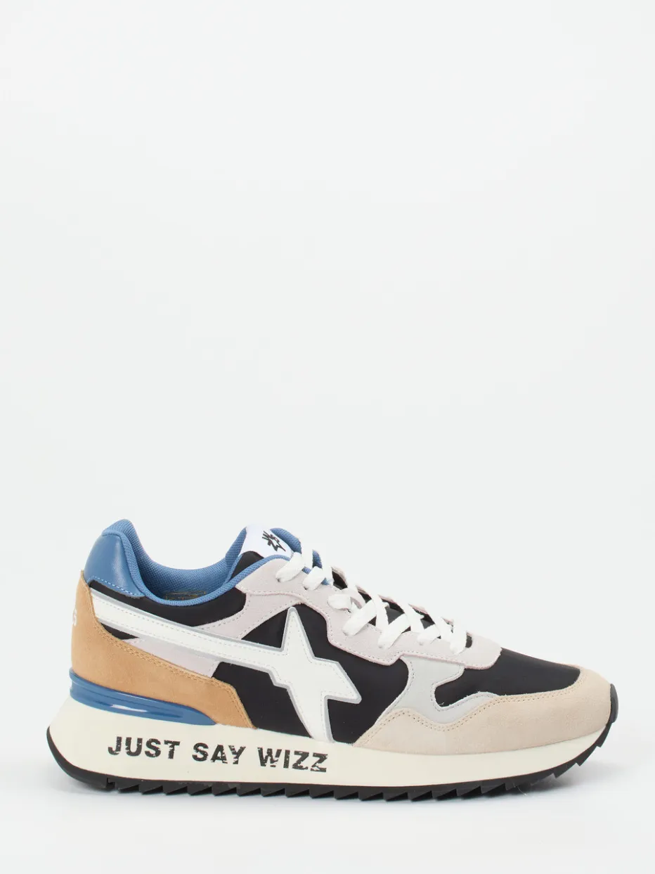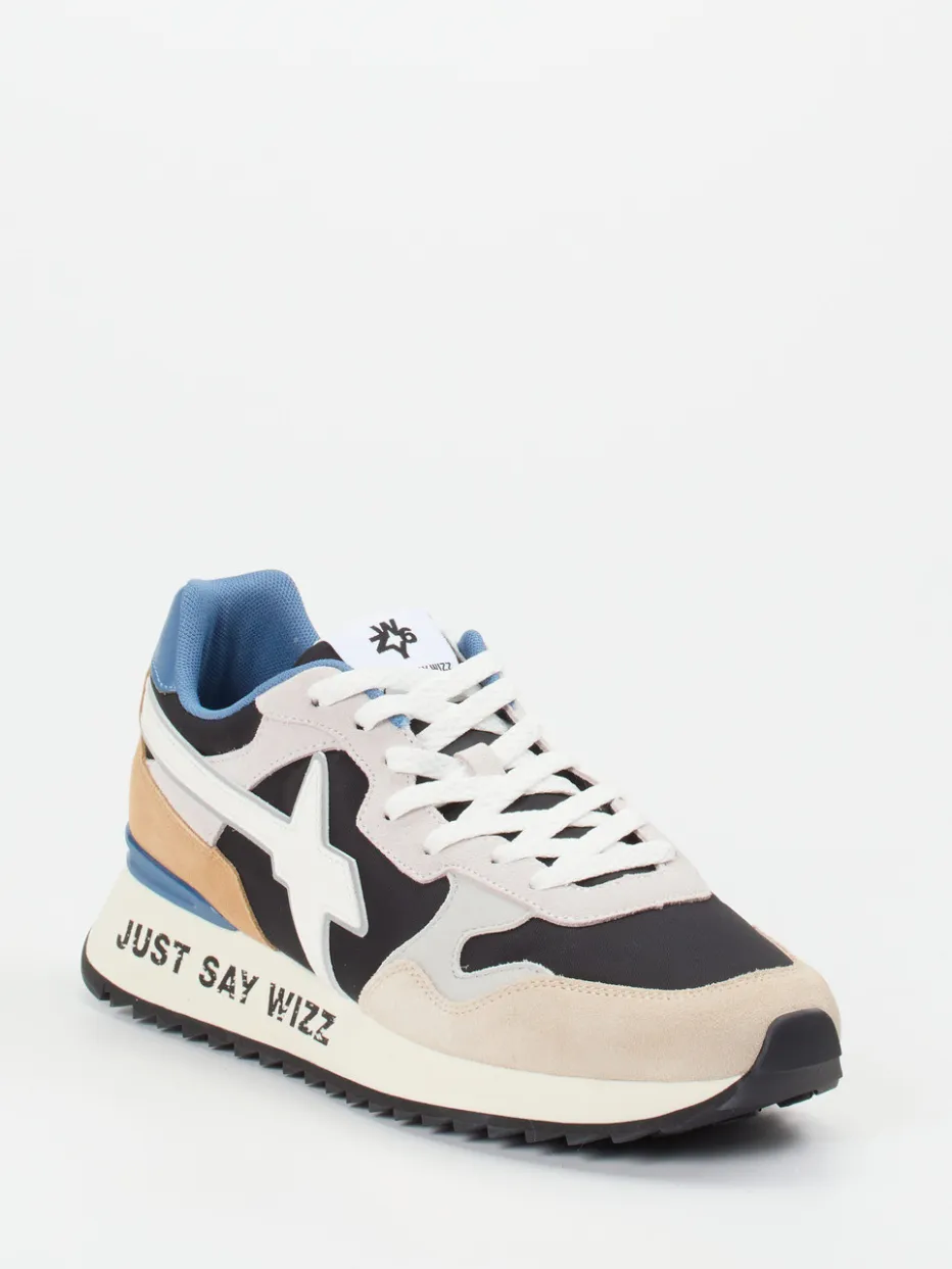 Ideal für den Alltag und trendige Freizeitlooks: Das beige Veloursleder, ergänzt durch Mesh und synthetisches Glattleder, sorgt für angenehmen Tragekomfort und spannende Haptik. Kontrastakzente in Schwarz, Cognacbraun und Stahlblau setzen visuelle Highlights. Die flache Form mit betonter Ferse, gepolstertem Schaft und profilierter Laufsohle verspricht sicheren Halt. Ein großflächiges Seitenlogo und der Slogan „JUST SAY WIZZ“ verstärken den Y2K-Streetwear-Look. Kombinierbar mit Retro-Jacken oder monochromen Outfits.