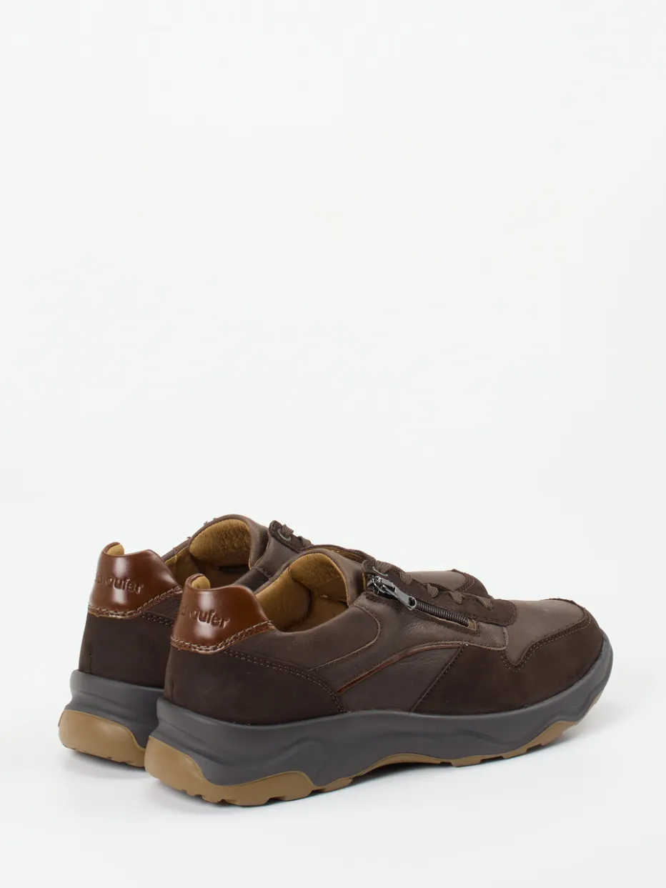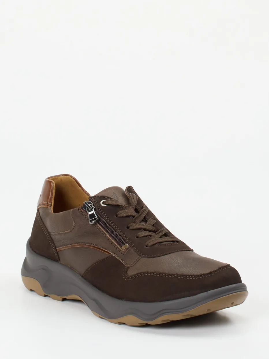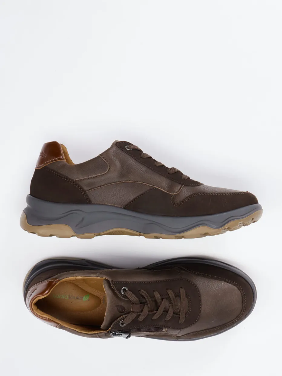 Sportiver Komfort für jeden Tag.Waldläufer zeigt mit diesem Komfort-Sneaker einen alltagstauglichen Herrenschuh mit entspanntem Charakter. Ideal für lange Spaziergänge oder Wege in der Stadt: Der Sneaker aus geschmeidigem Kalbleder vereint glatte und raue Lederstrukturen in dunklem Braun und bietet damit visuelle Tiefe und angenehme Haptik. Die Kombination aus Schnürung und Reißverschluss erleichtert das Anziehen, während der gepolsterte Schaftrand und die rutschfeste Gummisohle ein Plus an Bequemlichkeit ermöglichen. Minimalistische Details wie Ton-in-Ton-Nähte und ein glänzender Fersenbesatz unterstreichen die klare Linienführung. Lässt sich ideal zu Jeans, Chinos oder Casualwear kombinieren. Ein Schuh für Komfortliebhaber mit Faible für dezente Funktionen – typisch Waldläufer.
