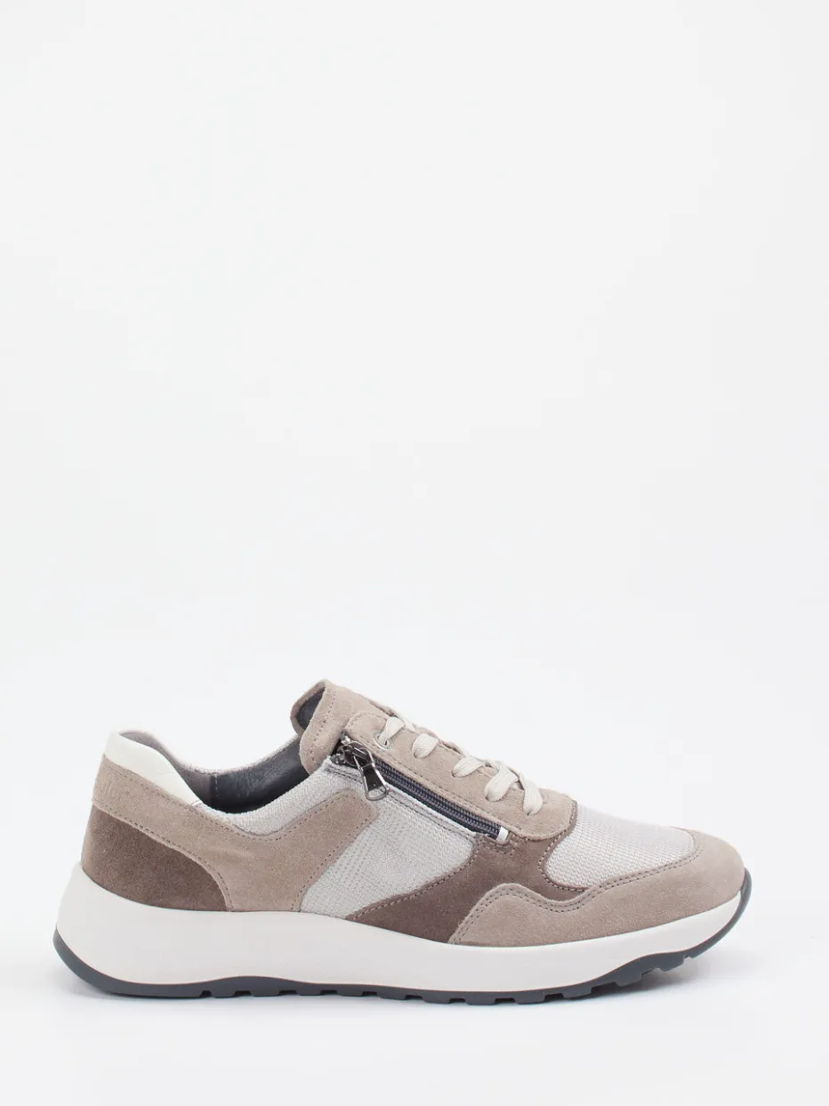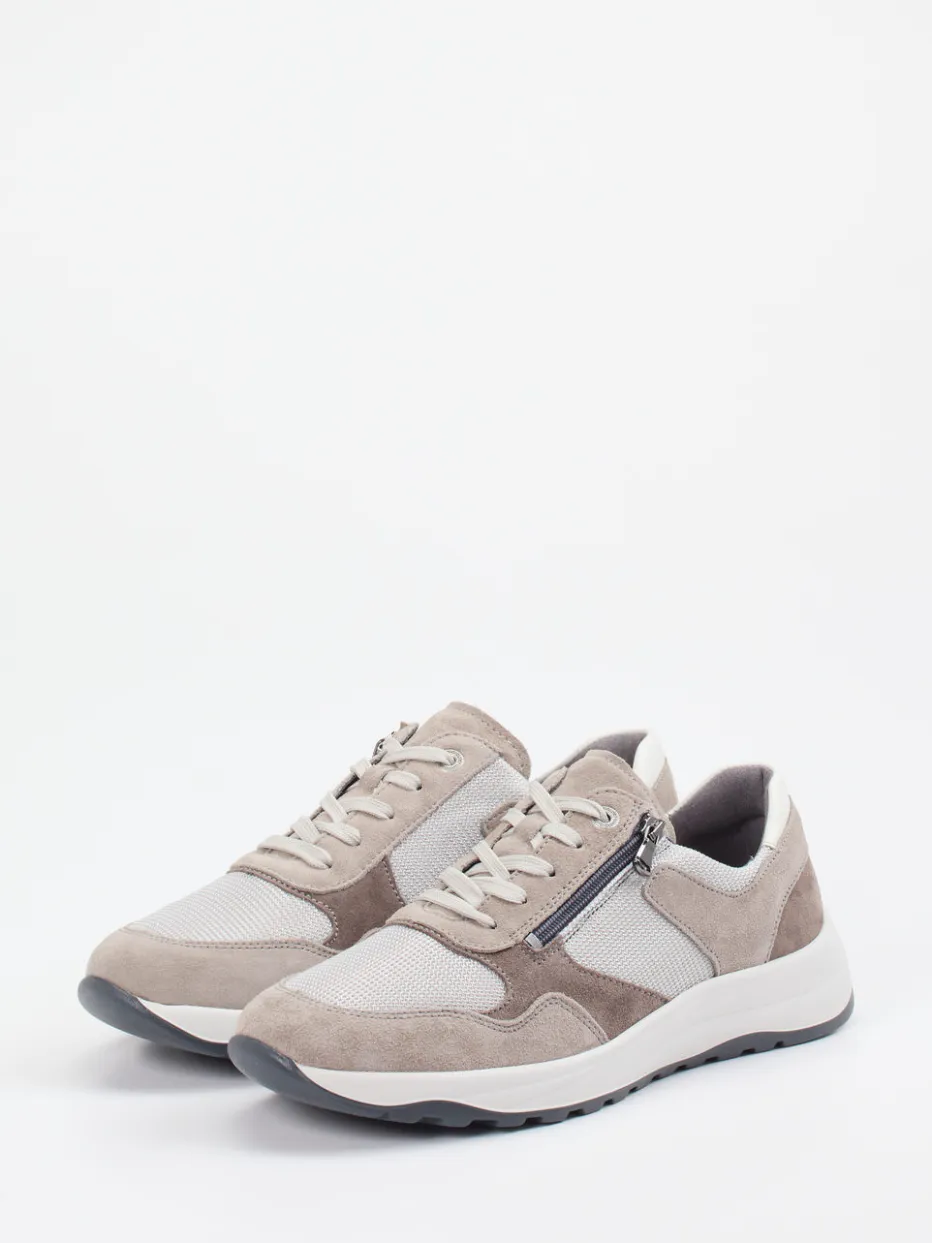Sportlicher Komfort mit minimalistischem Look.Waldläufer präsentiert einen Damen-Komfort-Sneaker für entspannt stilvolle Auftritte. Ideal für den Alltag oder Freizeitspaziergänge überzeugt er durch weiches Veloursleder in Beigegrau mit samtiger Oberfläche sowie atmungsaktives Mesh in Struktur-Optik. Der Silberreißverschluss an der Seite ergänzt die Schnürung funktional wie ästhetisch. Mit Memory-Foam-Fußbett, gepolstertem Schaftrand und stoßdämpfender Gummisohle bietet das Modell hohen Tragekomfort. Die klassische Silhouette in soften Neutralfarben passt zum Trend „Quiet Luxury SS24“ und ergänzt legere Outfits ideal. Leichter Komfort trifft ästhetische Zurückhaltung – charakteristisch Waldläufer.