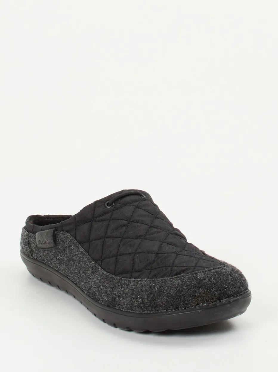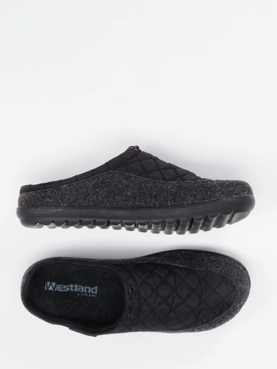 Dieser gepolsterte Hausschuh von Westland kombiniert gestepptes Textil mit griffigem Filz und bietet zuverlässigen Komfort für drinnen. Die profilierte Gummisohle sorgt für rutschfesten Halt auf allen Untergründen.