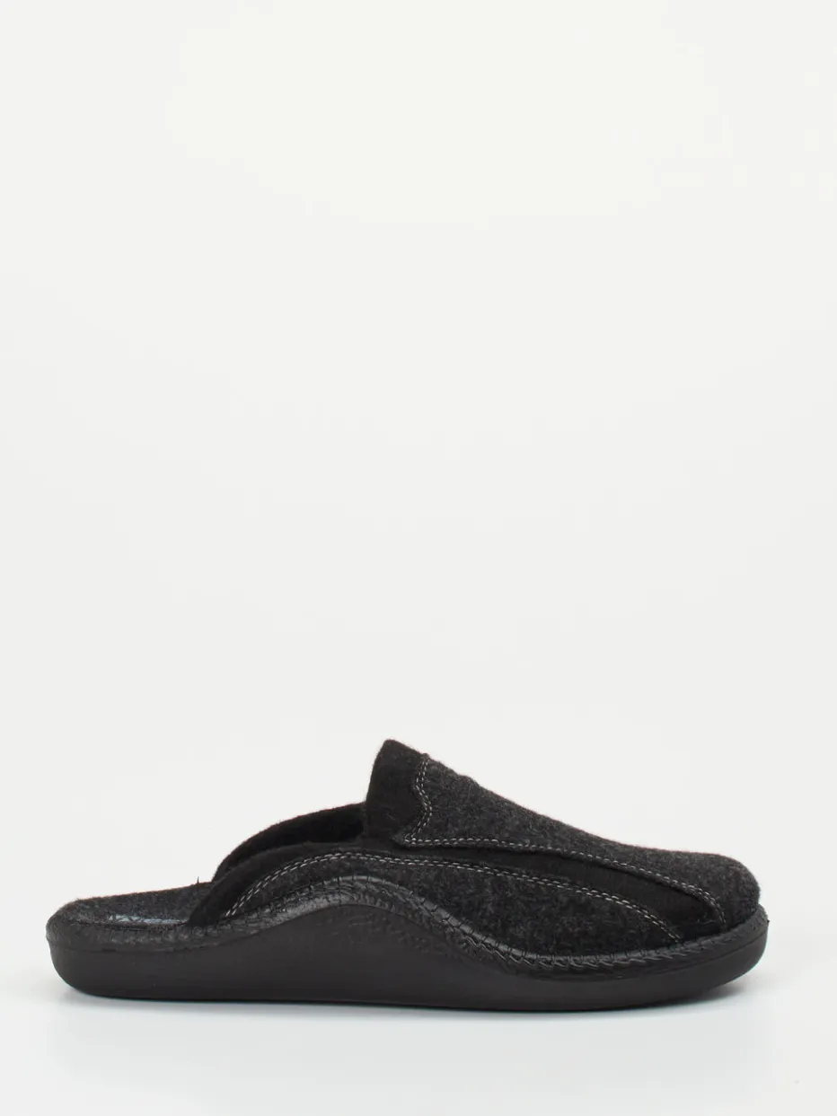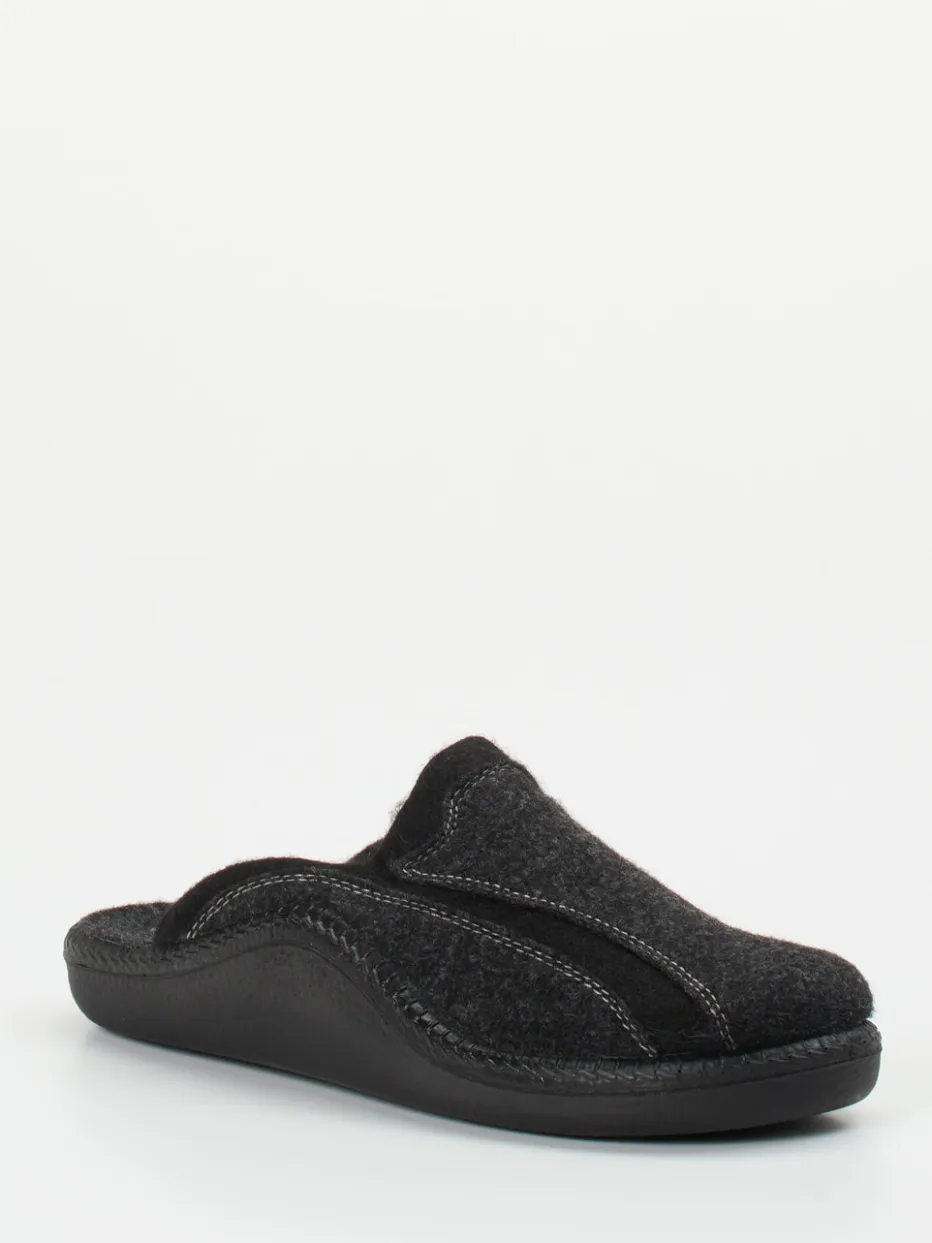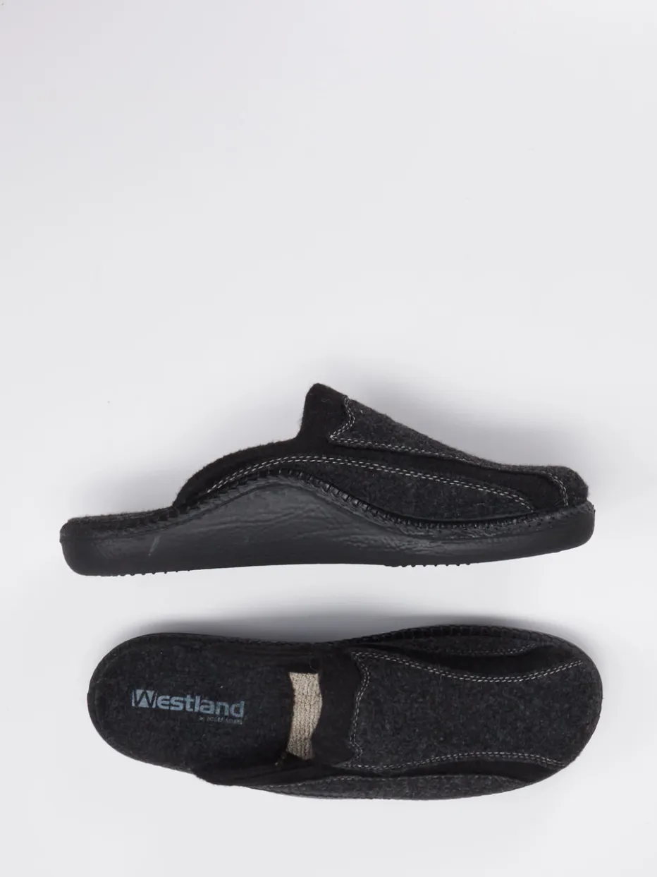 Komfort trifft zeitloses Design.Westland präsentiert mit diesen Pantoffeln aus Filz ein Modell, das ganz auf häusliches Wohlgefühl ausgelegt ist. Ob nach einem langen Arbeitstag oder für gemütliche Wintermorgen: Der warme, samtig-filzige Softfilz in Anthrazitgrau bietet ein angenehmes Fußklima, unterstützt durch ein filz- und textilbezogenes Fußbett. Die offene Schlupfform hinten ermöglicht ein leichtes An- und Ausziehen, die ergonomisch geformte PU-Laufsohle wirkt stoßdämpfend und rutschhemmend. Hellgraue Kontrastnähte unterstreichen das dezente Design mit minimalistischem Charakter. Ideal kombinierbar mit Loungewear oder kuscheligen Hausanzügen. Maximaler Tragekomfort für stilbewusste Entspannungsphasen zuhause.