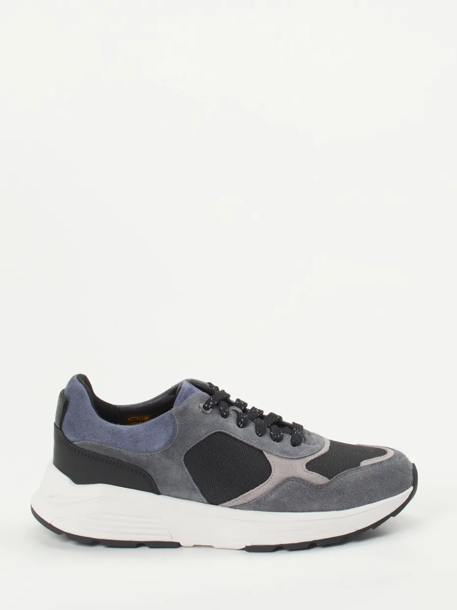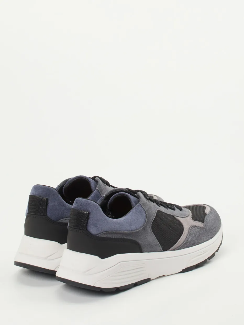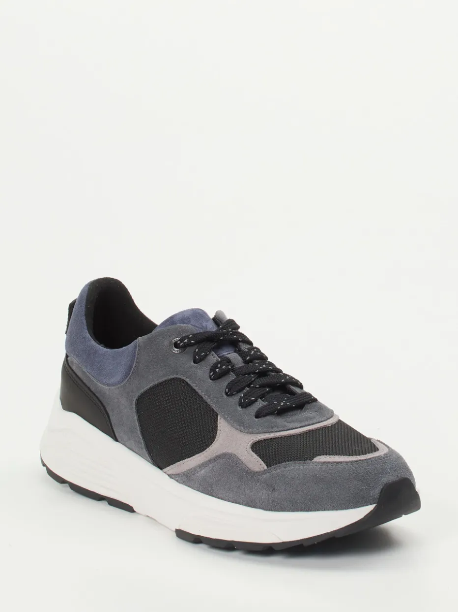 Perfekt für urban aktive Tage überzeugt der Schuh mit einem Mix aus blaugrauem Veloursleder und strukturiertem Mesh in Anthrazit. Die weich gebürstete Oberfläche verleiht ein edles Finish, während reflektierende Schnürsenkel für Sichtbarkeit sorgen. Die mehrlagige, gedämpfte Chunky-Sohle in Schneeweiß ergänzt den Retro-Runner-Stil und sorgt für rutschfesten Halt. Dezente Farbkontraste in Schieferblau und Hellgrau setzen optische Akzente. Der gepolsterte Schaftrand und die verstärkte Ferse unterstreichen Alltagstauglichkeit und Komfort.