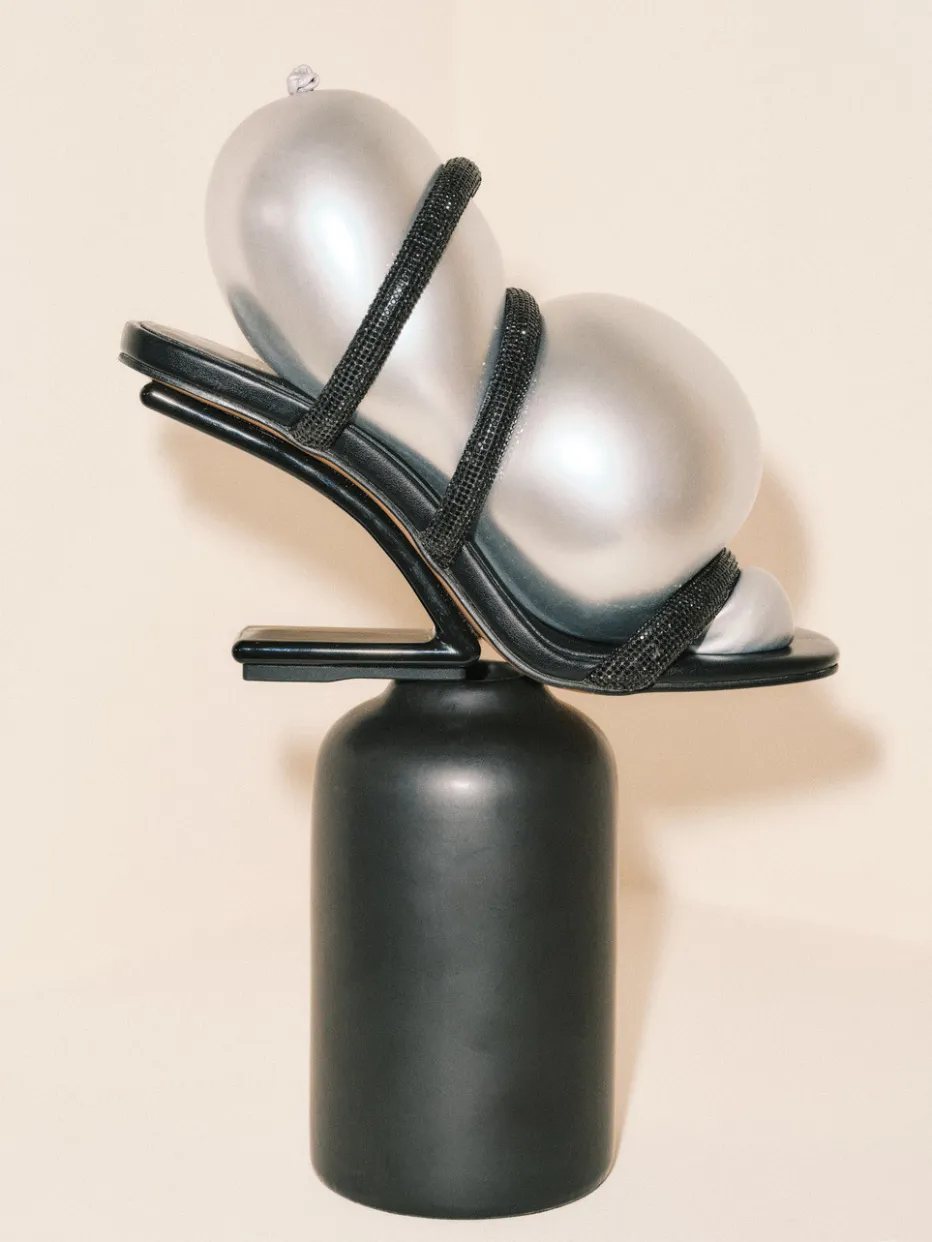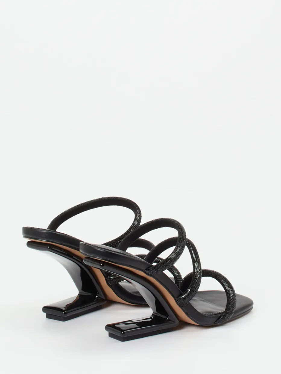 Dieser Mule verbindet glamouröse Glitzerdetails mit einem kunstvoll skulpturierten Absatz – das perfekte Statement für anspruchsvolle Abendlooks.