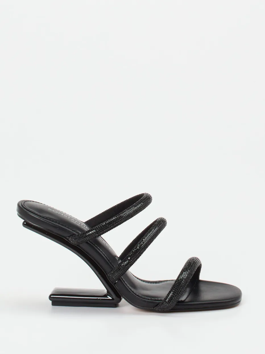 Extravaganz in stilvoller Silhouette.Konstantin Starke präsentiert mit dieser Sandalette ein modisches Highlight der Saison. Für einen großen Auftritt am Abend bietet sich dieser Mule mit schwarzen Metallicleder-Riemen an. Die vier asymmetrisch angeordneten Riemen schimmern glitzernd und kontrastieren stilvoll zum glänzend lackierten, skulptural geformten Absatz. Offen designt, setzt die elegante Linienführung moderne Akzente im Sinne aktueller Trends wie „Sculptural Heels“ und „Black Shine“. Ideal für formelle Anlässe mit modischem Anspruch – von der Gala bis zur Cocktailparty. Kombiniert mit Metallic-Accessoires entsteht ein harmonisch abgestimmter Look. Modebewusste Ästhetik trifft bei Konstantin Starke auf trendsetzende Formenvielfalt.