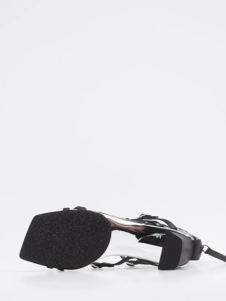 Seit 2003 begeistert das Label United Nude mit extravaganten Entwürfen. Hier präsentiert die Marke eine feminin-rockige Sandalette aus schwarzem Kalbleder, die durch ihren besonderen Material-Mix besticht. Die knöchelhohen Riemchen mit unterschiedlichen Prägungen bilden einen aufregenden Kontrast zu den kleinen, silberfarbenen Schließen und dem spiegelnden Metallicrahmen. Neben dem modischen Carréleisten wird auch der glänzende Blockabsatz zu einem Blickfang. Funktional und schmückend zugleich ist der Reißverschluss an der Ferse. Die Innensohle ist weich gepolstert.