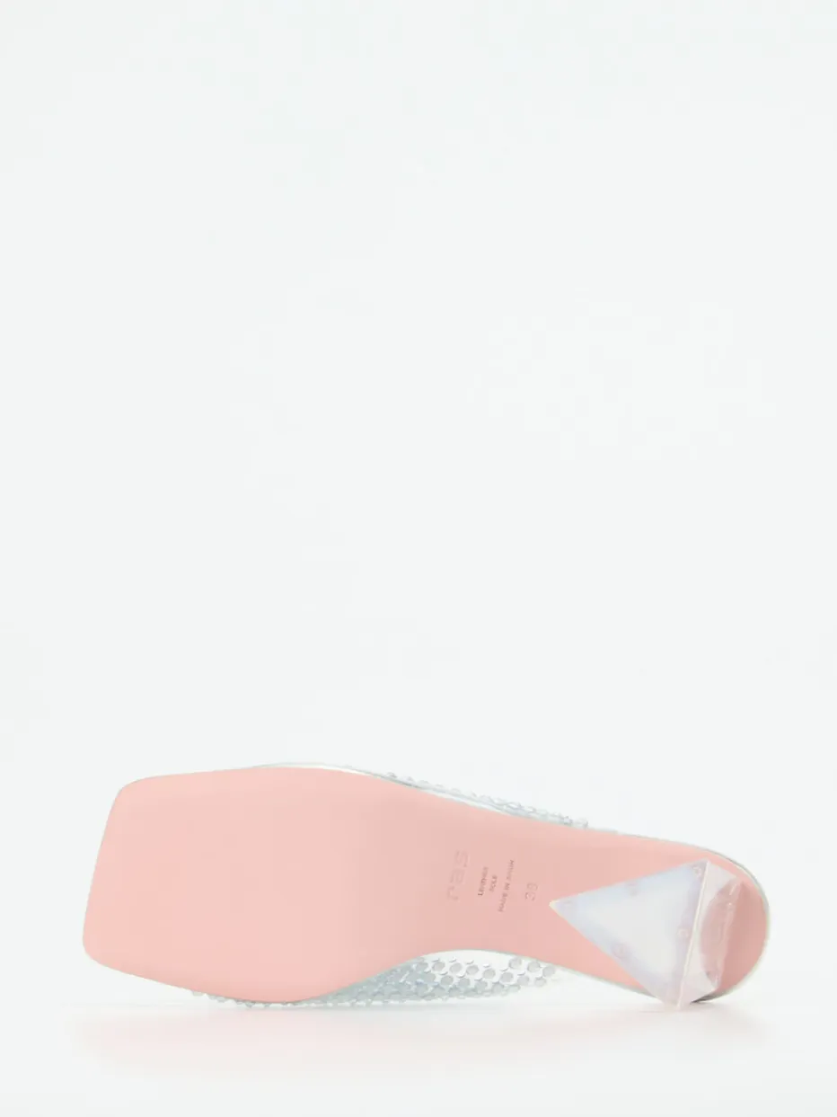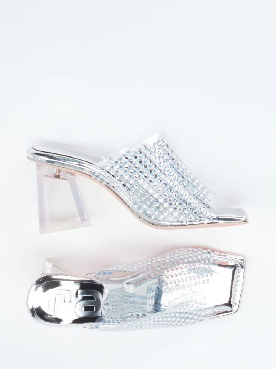Funkelnder Auftritt für lange Nächte.RAS interpretiert die klassische Damen-Pantolette neu und setzt bei diesem Modell auf maximale Wirkung. Ideal für glamouröse Events überzeugt dieser High Heel mit edlem Metallicmaterial, das durch eine glänzende Oberfläche und silberfarbenen Strassbesatz veredelt wird. Die offen-spitze Silhouette mit eckiger Front betont die modische Ausrichtung, während der transparente Blockabsatz in asymmetrischer Form das Trendthema Y2K gekonnt aufgreift. Die silberfarbene Ledersohle sowie dezente Verchromungen unterstreichen den High-Gloss-Charakter. Besonders wirkungsvoll zu monochromen Abendlooks oder Metallic-Accessoires. Ein Eyecatcher mit modischer Relevanz und markentypischer Designschärfe.