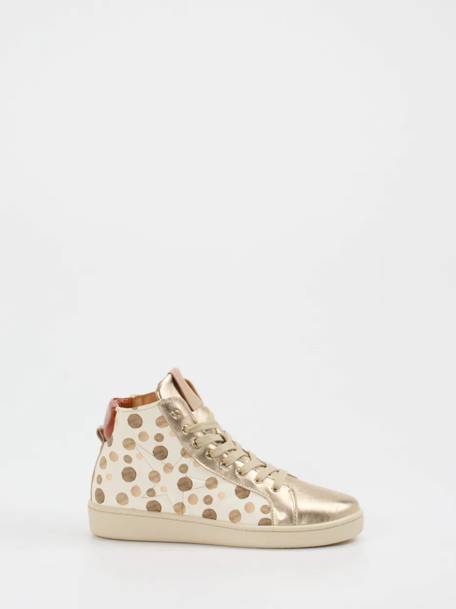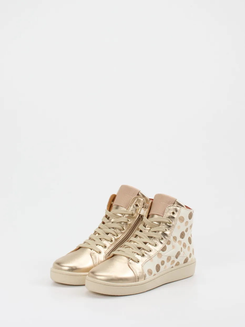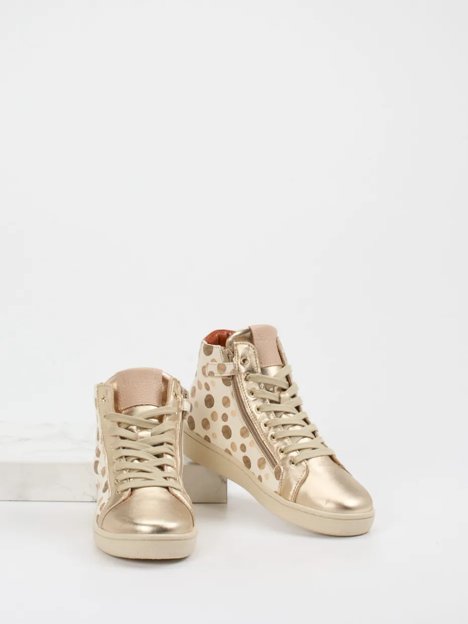 Glanz trifft Struktur.Bisgaard präsentiert einen modischen High-Top-Sneaker für Damen mit besonderer Detailverliebtheit. Ideal für urbane Freizeitmomente überzeugt das Modell mit geprägtem Leder, das durch einen glänzenden Finish-Effekt und goldfarbene Metallic-Akzente unterstrichen wird. Ein beigefarbener Grundton, rotbraune Lackleder-Details an der Ferse und ein augenfälliges Punktmuster verleihen dem Schuh seinen trendstarken Charakter. Die Kombination aus Schnürung und seitlichem Reißverschluss sorgt für Alltagstauglichkeit mit Stil. Dank rutschhemmender Gummisohle steht auch dem nächsten Party-Abend nichts im Weg. Markentypische Funktionalität trifft auf verspieltes Design – der perfekte Mix für trendorientierte Looks.